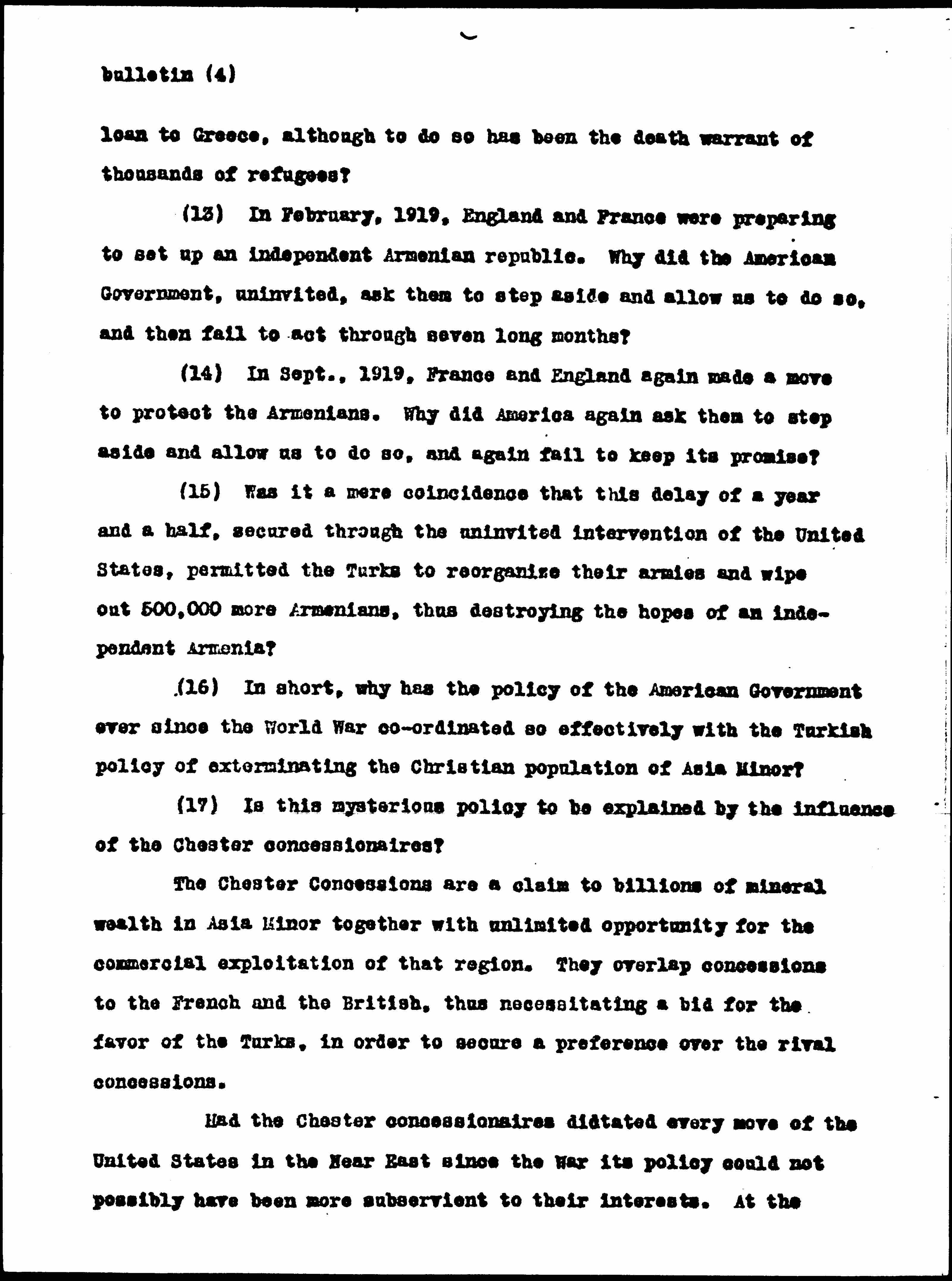 (16) In short, why has the policy of the American Government ever since the World War [coordinated] so effectively with the Turkish policy of exterminating the Christian population of Asia Minor?