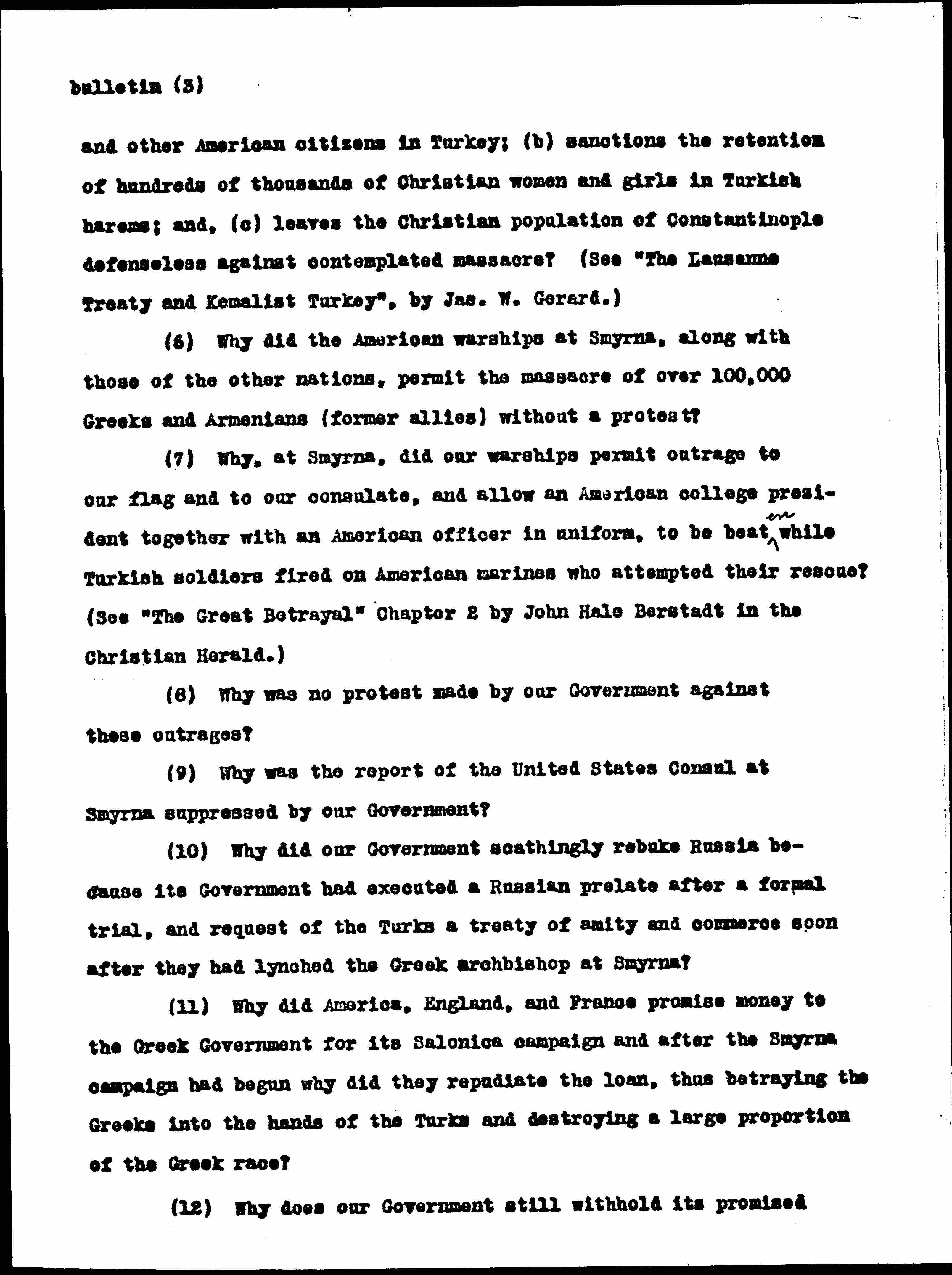 (3) Why did the American representatives at the Lausanne Conference join hands with the Turks against the English and the French to defeat the establishment of a National Armenian Home? (This refusal was the death warrant for hundreds of thousands who loved the very name of America.) (See "The Lausanne Treaty and Kemalist Turkey" by Jas. W. Gerard, pp. 24 and 25.)