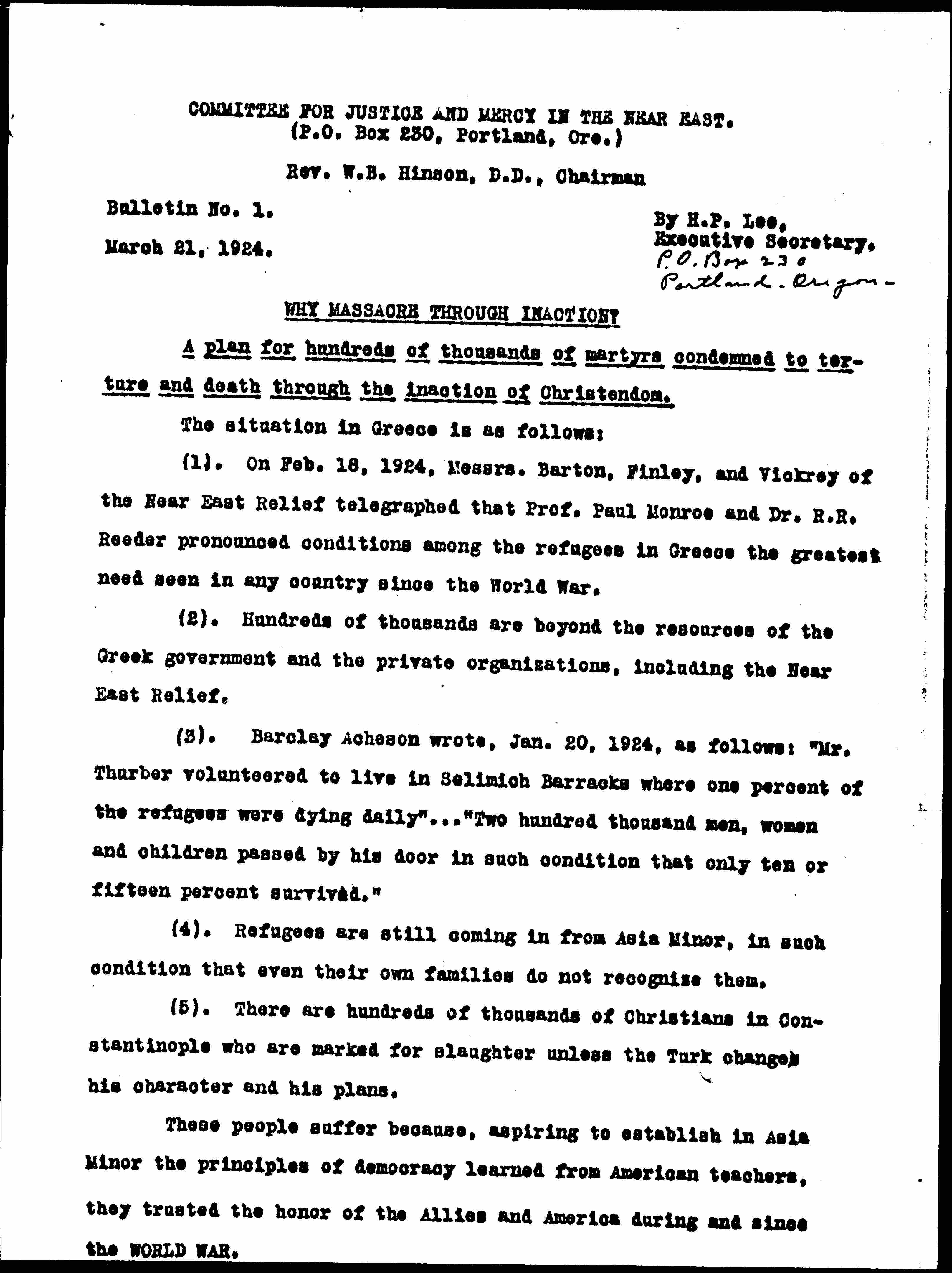 To abandon these refugees in Greece is massacre through inaction, -- more culpable than the direct massacres by the Turks because lacking in the incentive of religious and political and racial rivalry. It is contrary to the deepest principles of morality, of civilization and of Americanism. It is a repudiation of every principle of Christianity, and a defiance of and blasphemy against the Creator. It is the most insidious and deadly possible attack on democracy, on religion and on civilization.