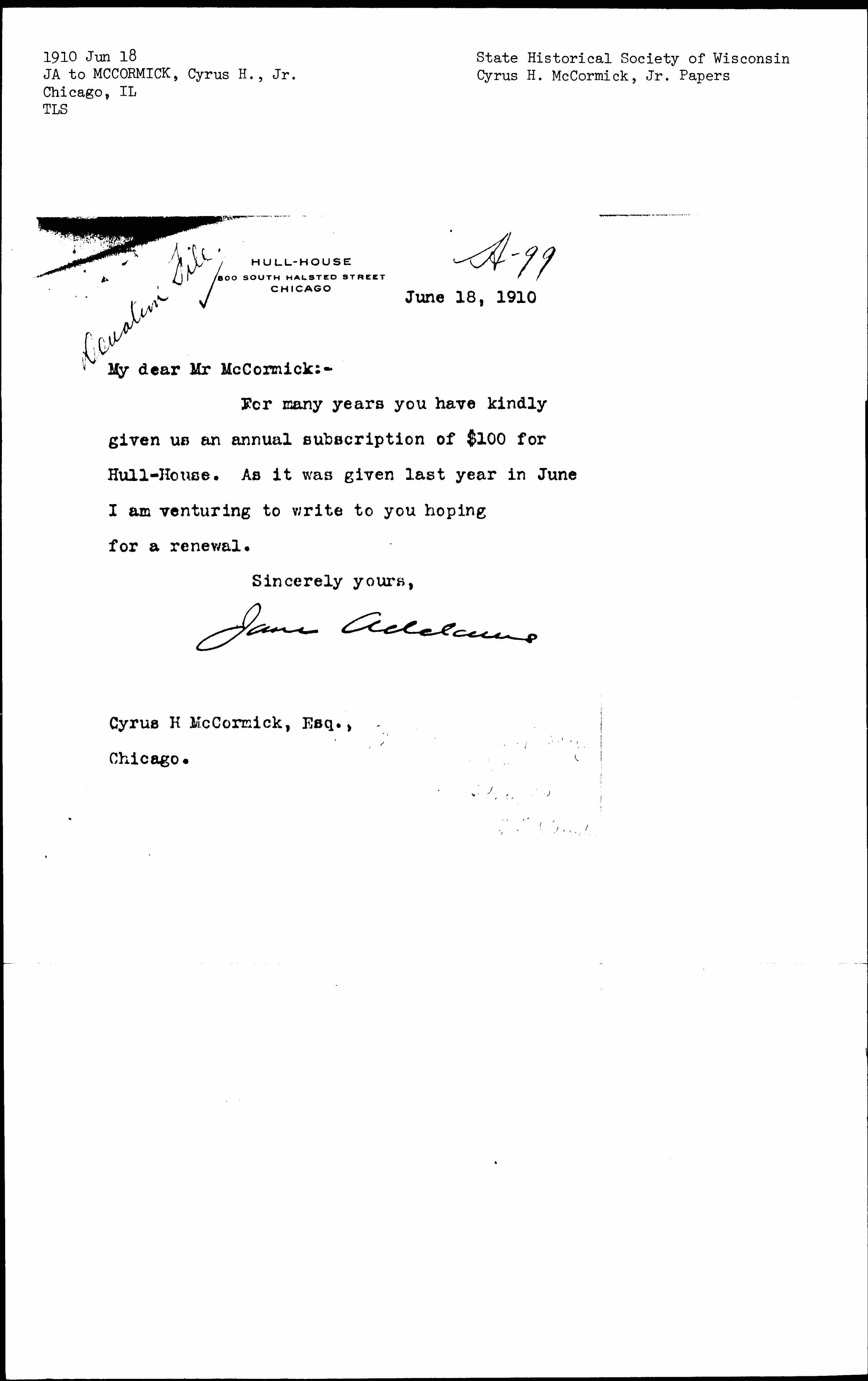 For many years you have kindly given us an annual subscription of $100 for Hull-House. As it was given last year in June I am venturing to write you hoping for a renewal.