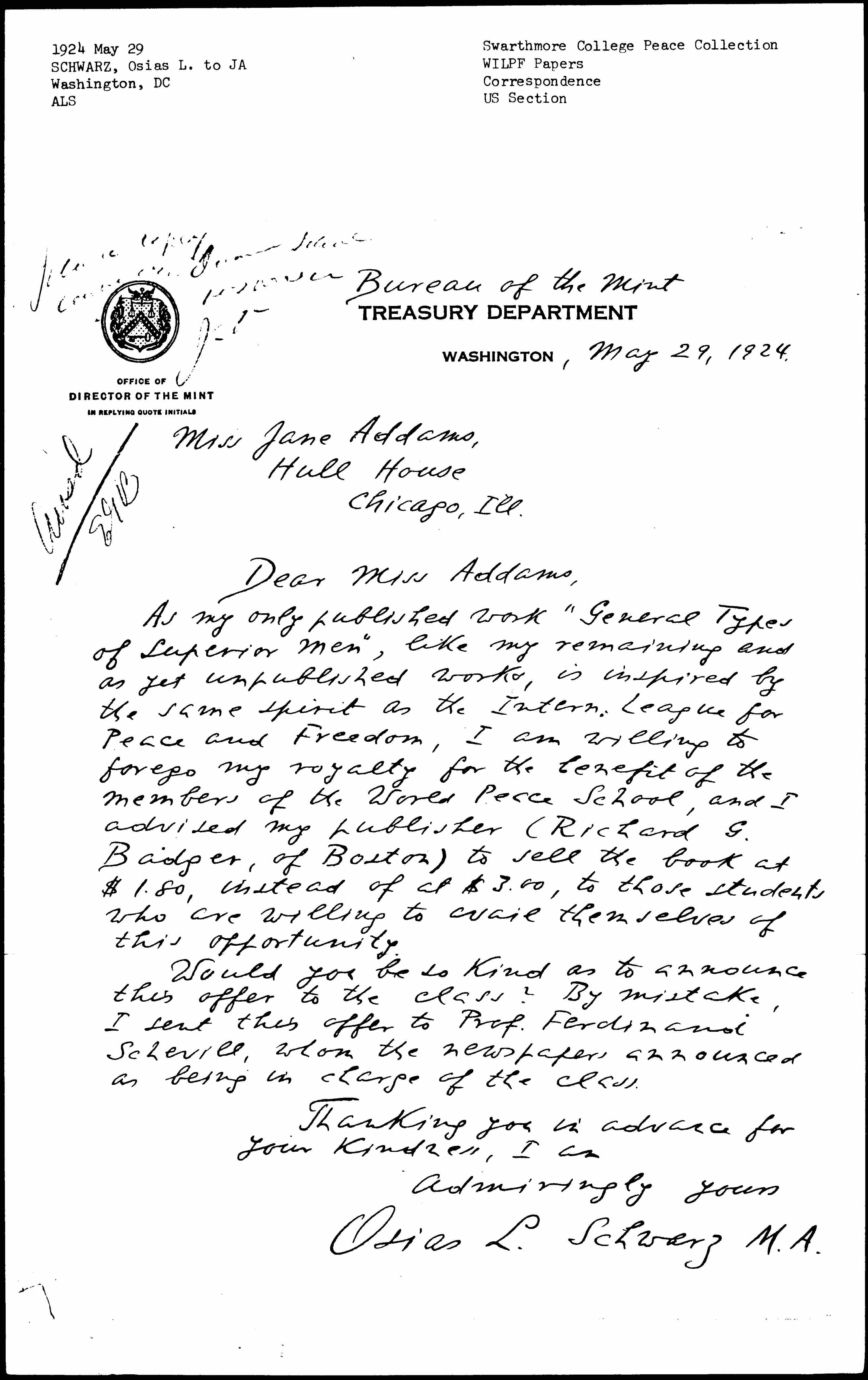 As my only published work "General Types of Superior Men," like my remaining and as yet unpublished works, is inspired by the same spirit as the Intern. League for Peace and Freedom, I am willing to forego my royalty for the benefit of the members of the World Peace School, and I advised my publisher (Richard G. Badger, of Boston) to sell the book at $1.80, instead of at $3.00, to those students who are willing to avail themselves of this opportunity.