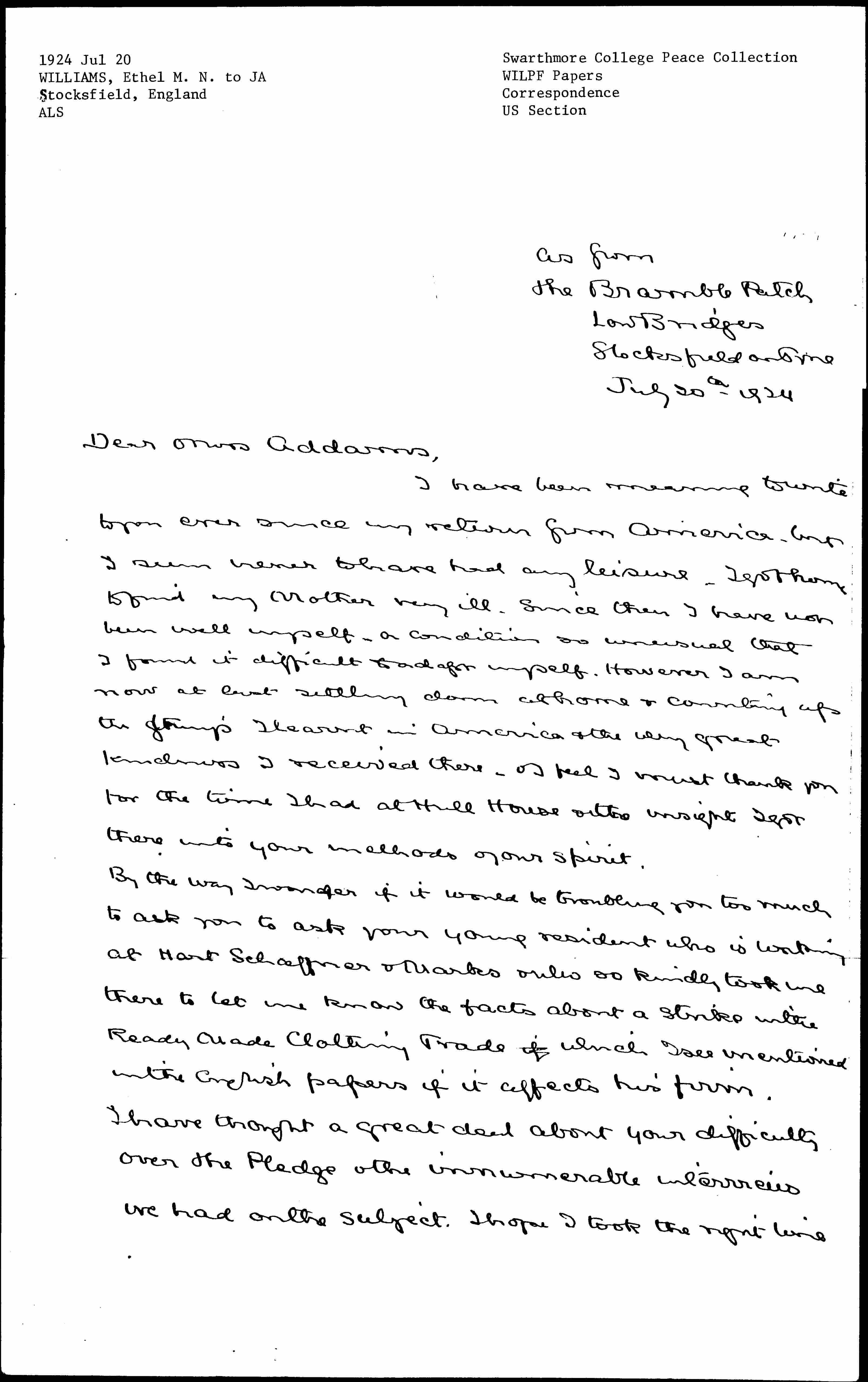 I have been meaning to write to you ever since my return from America, but I seem never to have had any leisure. I got home to find my Mother very ill. Since then I have not been well myself -- a condition so unusual that I found it difficult to adapt myself. However I am now at last settling down at home & counting up the things I [learned] in America & the very great kindness I received there -- & I feel I must thank you for the time I had at Hull House & the insight I got there into your methods & your spirit.
