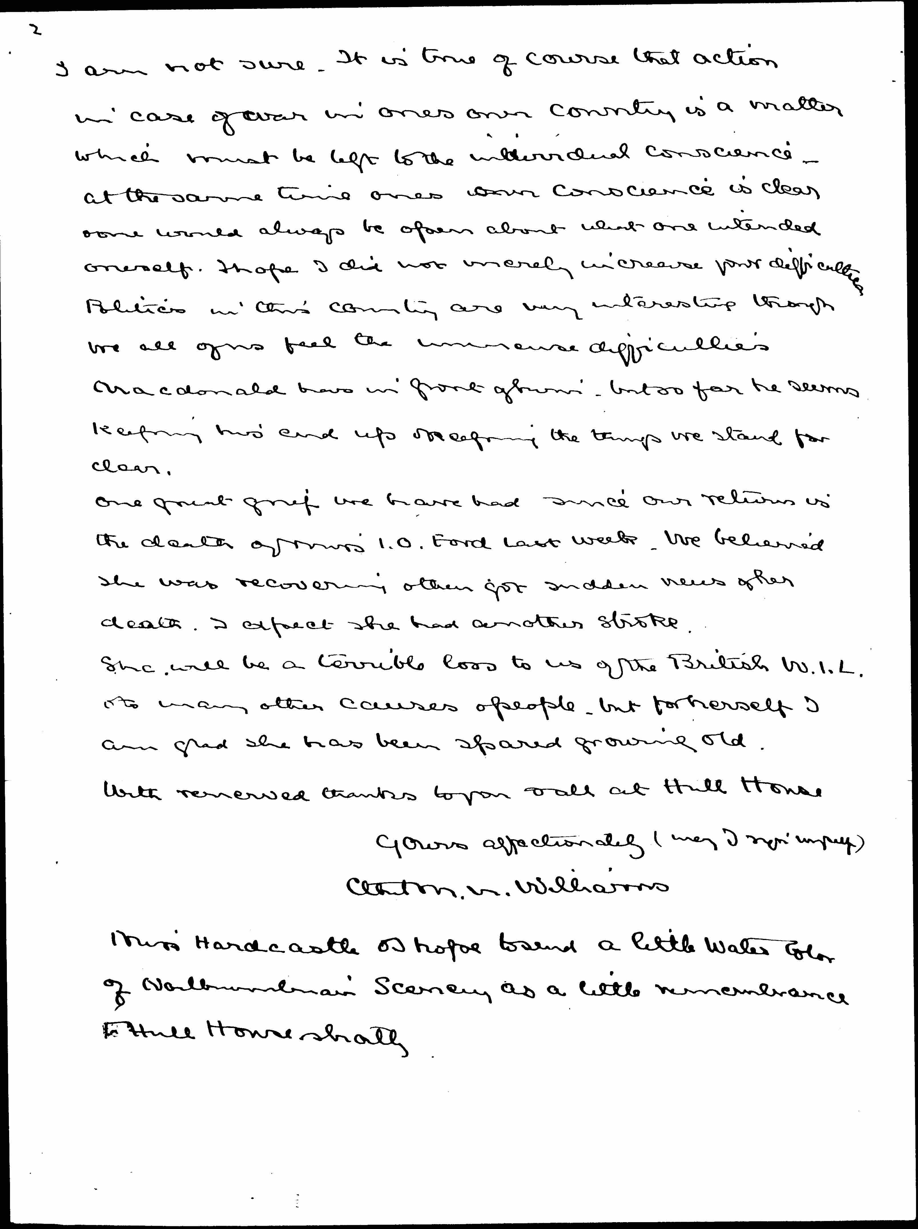 She will be a terrible loss to us of the British W.I.L. & to many other causes & people -- but for herself I am glad she has been spared growing old.