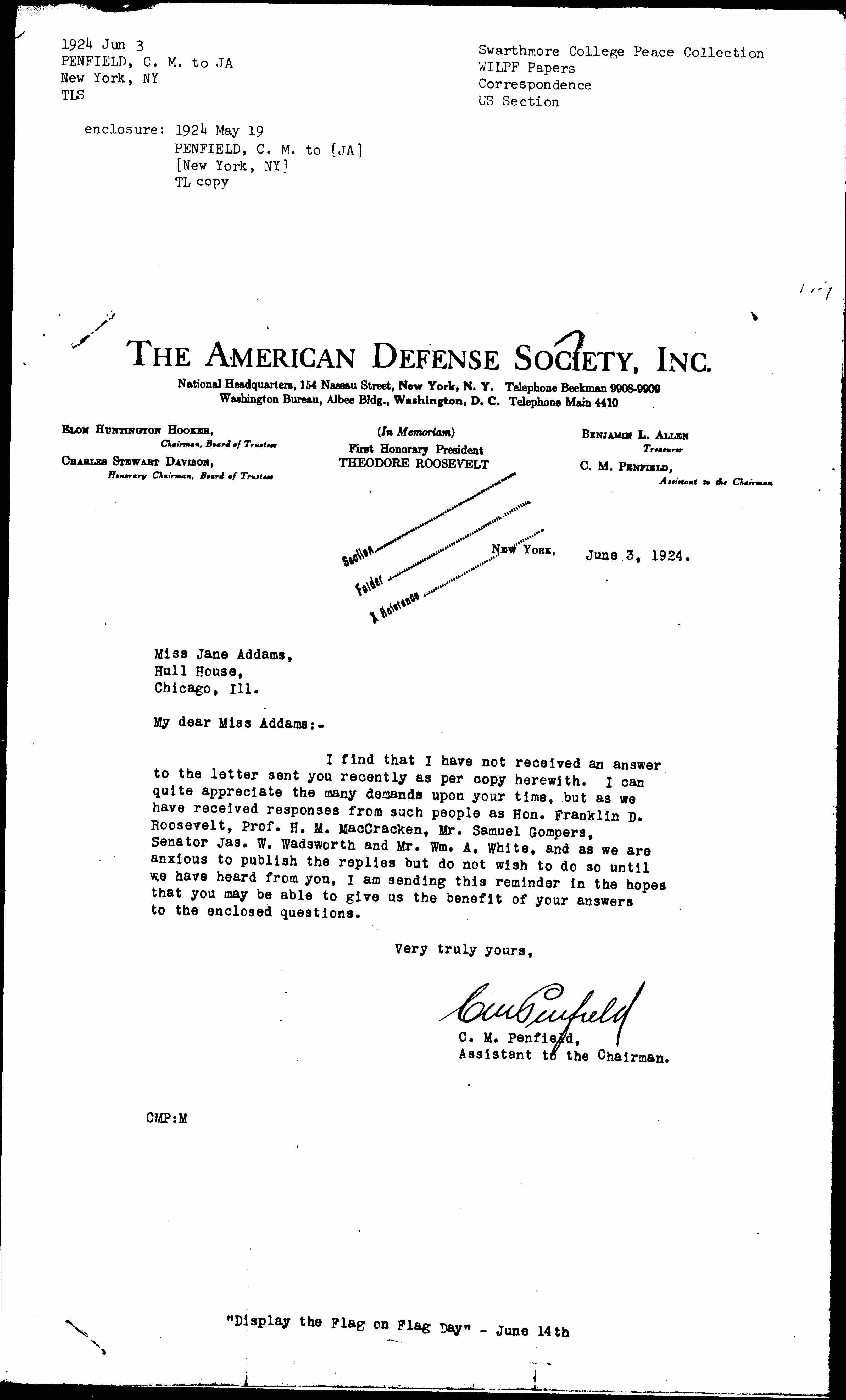 I find that I have not received an answer to the letter sent you recently as per copy herewith. I can quite appreciate the many demands upon your time, but as we have received responses from such people as Hon. Franklin D. Roosevelt, Prof. H. M. MacCracken, Mr. Samuel Gompers, Senator Jas. W. Wadsworth and Mr. Wm. A. White, and as we are anxious to publish the replies but do not wish to do so until we have heard from you, I am sending this reminder in the hopes that you may be able to give us the benefit of your answers to the enclosed questions.