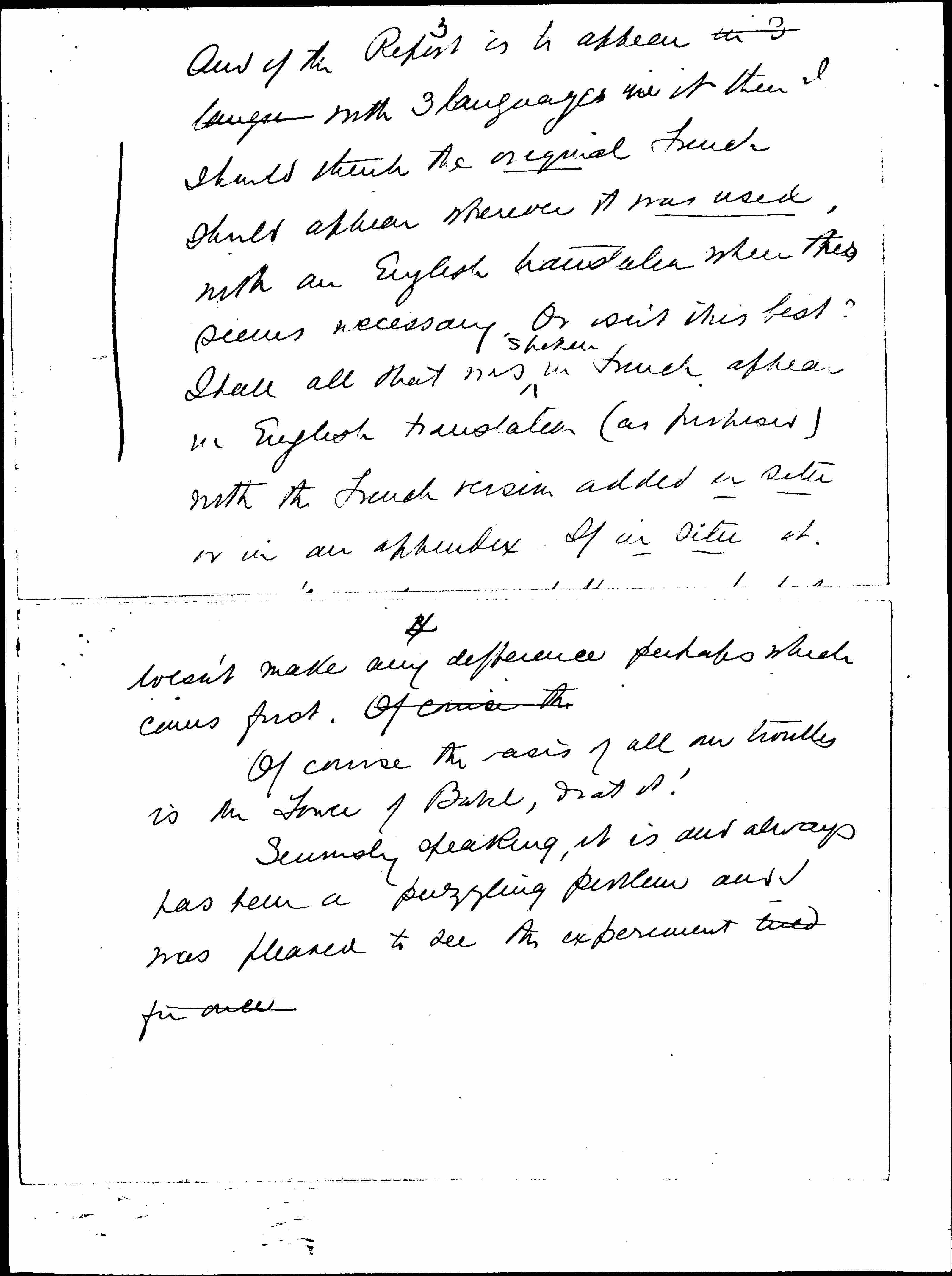 And if the Report is to appear in 3 langua with 3 languages in it then I should think the original French should appear wherever it was used, with an English translation when this seems necessary. Or isn't this best? Shall all that was ↑spoken↓ in French appear in English translation (as [proposed?]) with the French version added in situ or in an appendix. If in situ it [page 4] doesn’t make any difference perhaps which comes first. Of course the