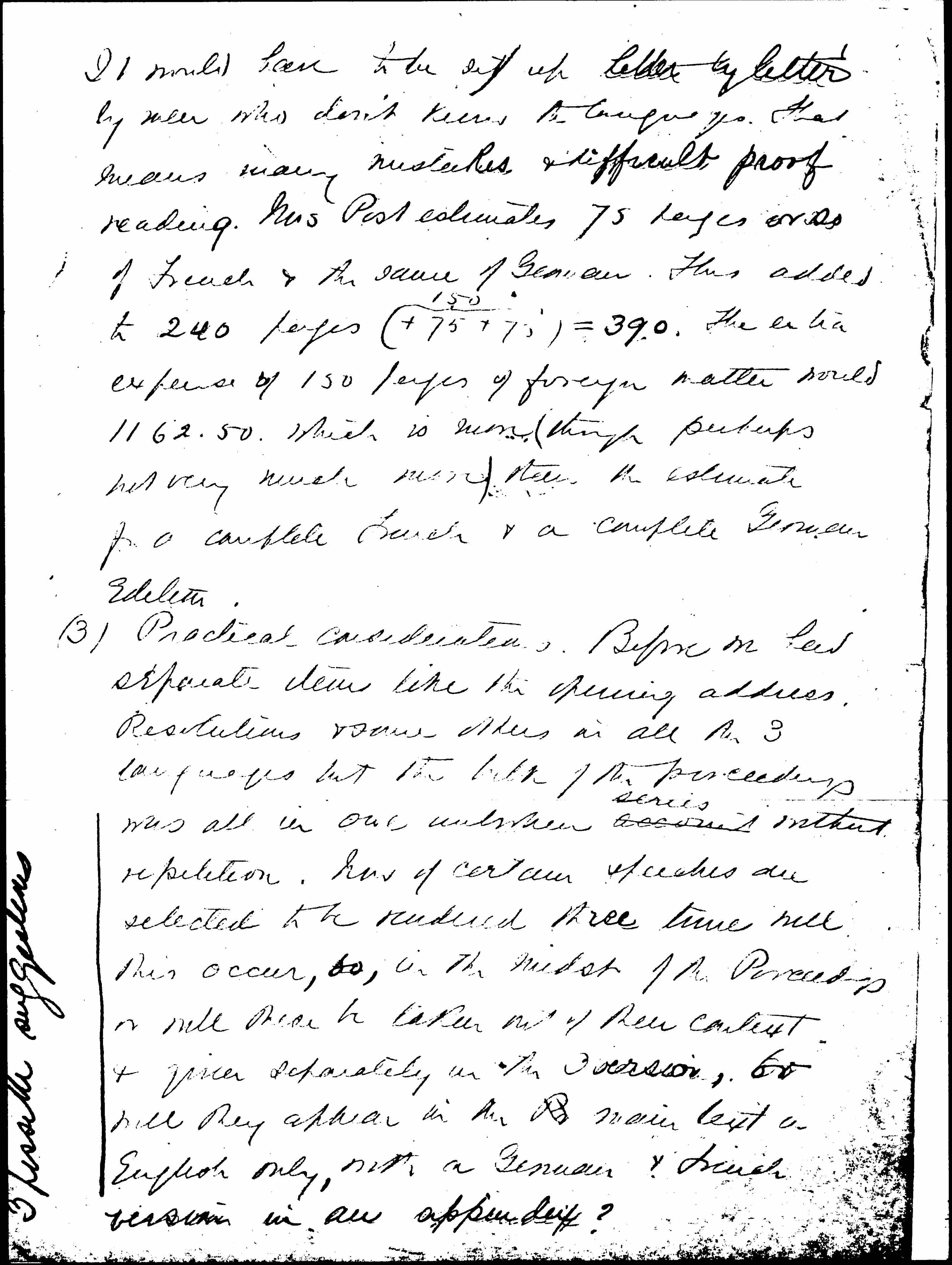 (3) Practical considerations. Before we had separate items like the opening address, Resolutions & some others in all the 3 languages but the bulk of the proceedings was all in one unbroken account ↑series↓ without repetition. Now if certain speeches are selected to be rendered three times will this occur, so, in the midst of the Proceedings or will these be taken out of their context & given separately in the 3 versions, or will they appear in the [illegible] main text [in] English only, with a German & French version in an appendix? [written up left margin] 3 possible suggestions [page 3]