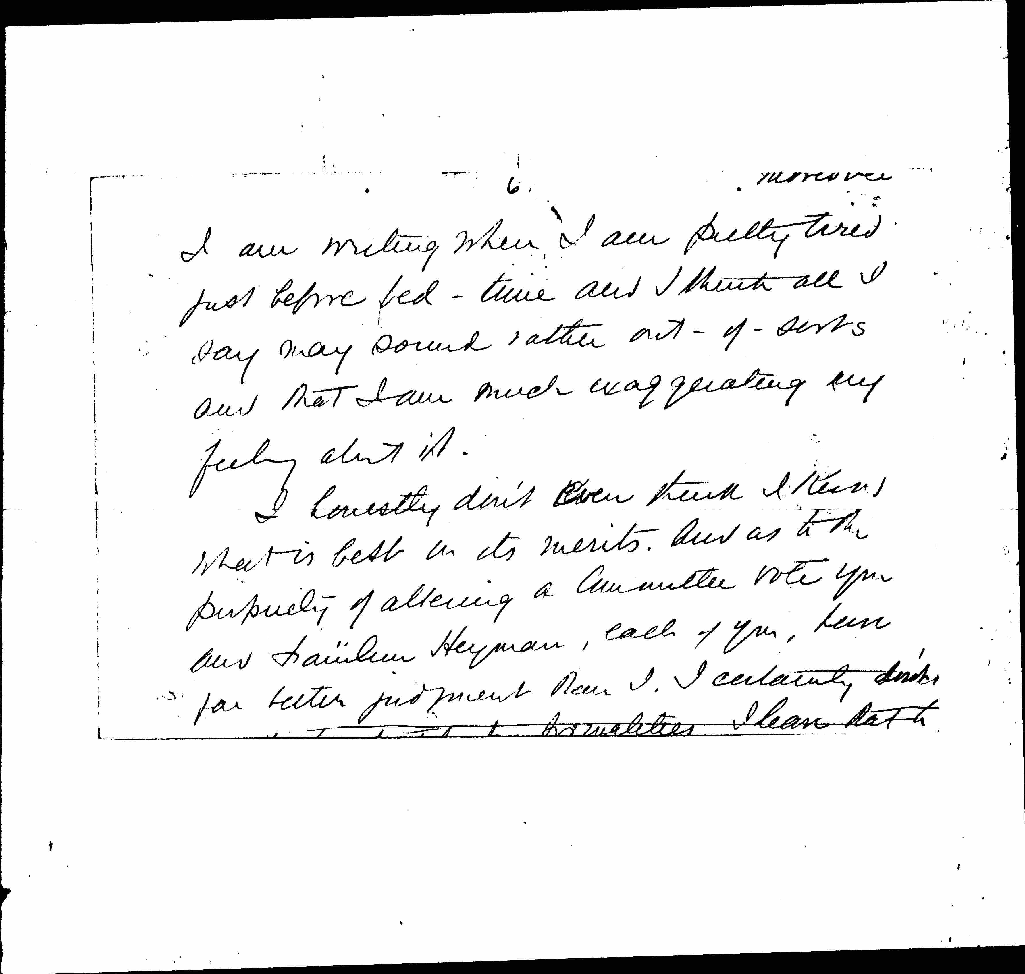 I have not seen the letter so I don't know the grounds of the ↑new↓ decision. Moreover [page 6] I am writing when I am pretty tired just before bed-time and I think all I say may sound rather out-of-sorts and that I am much exaggerating my feeling about it.