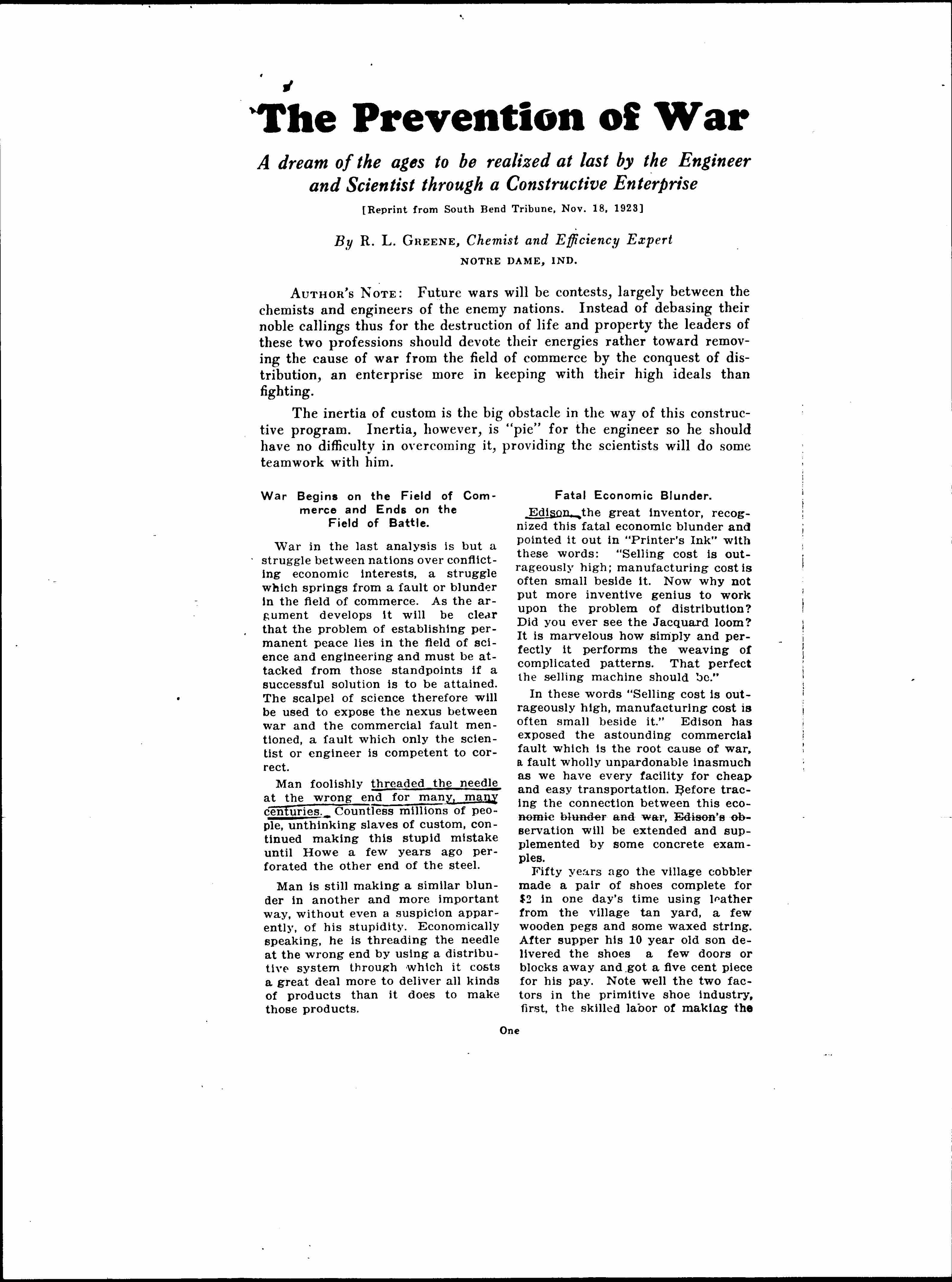 War in the last analysis is but a struggle between nations over conflicting economic interests, a struggle which springs from a fault or blunder in the field of commerce. As the argument develops it will be clear that the problem of establishing permanent peace lies in the field of science and engineering and must be attacked from those standpoints if a successful solution is to be attained. The scalpel of science therefore will be used to expose the nexus between war and the commercial fault mentioned, a fault which only the scientist or engineer is competent to correct.