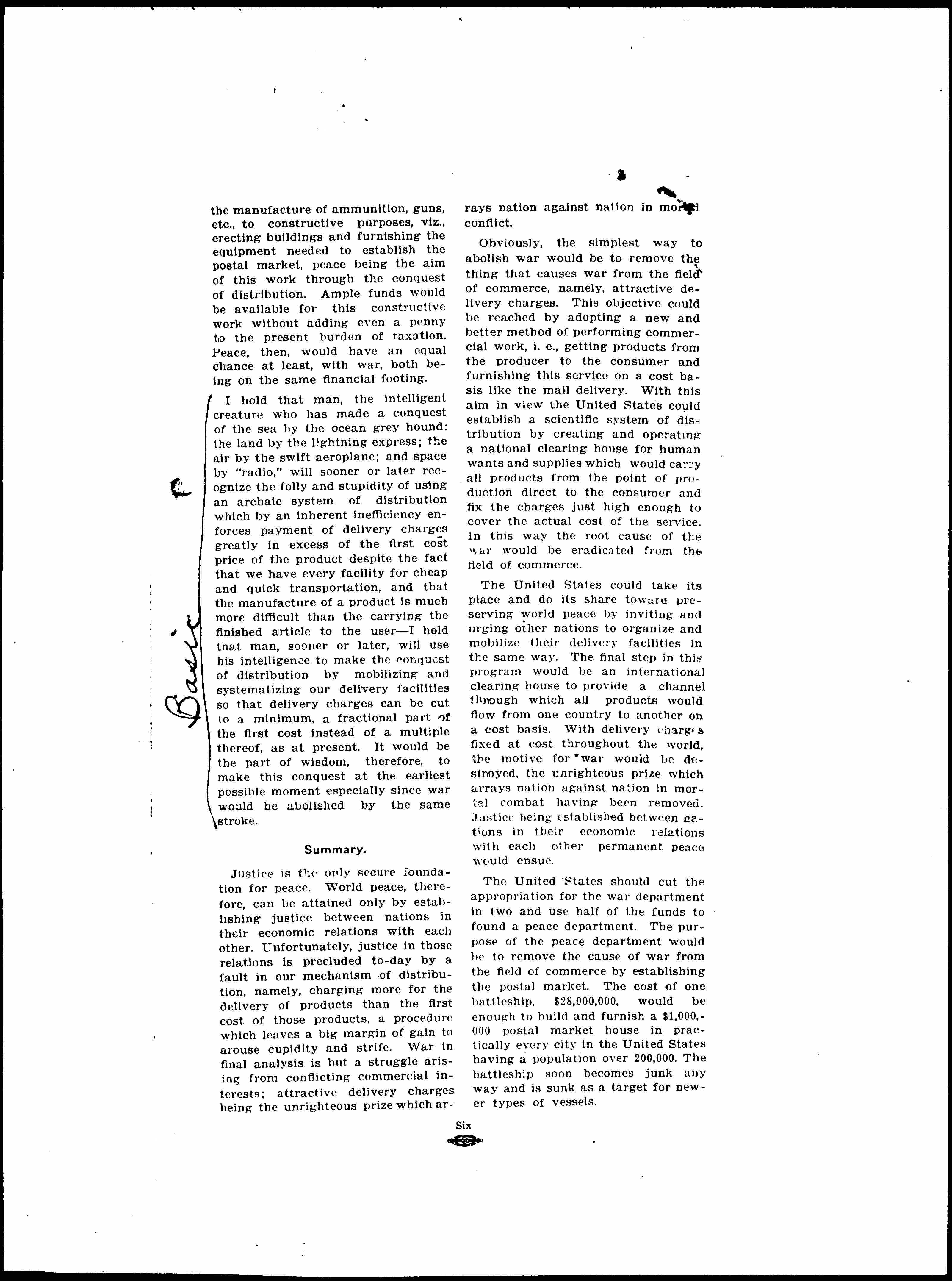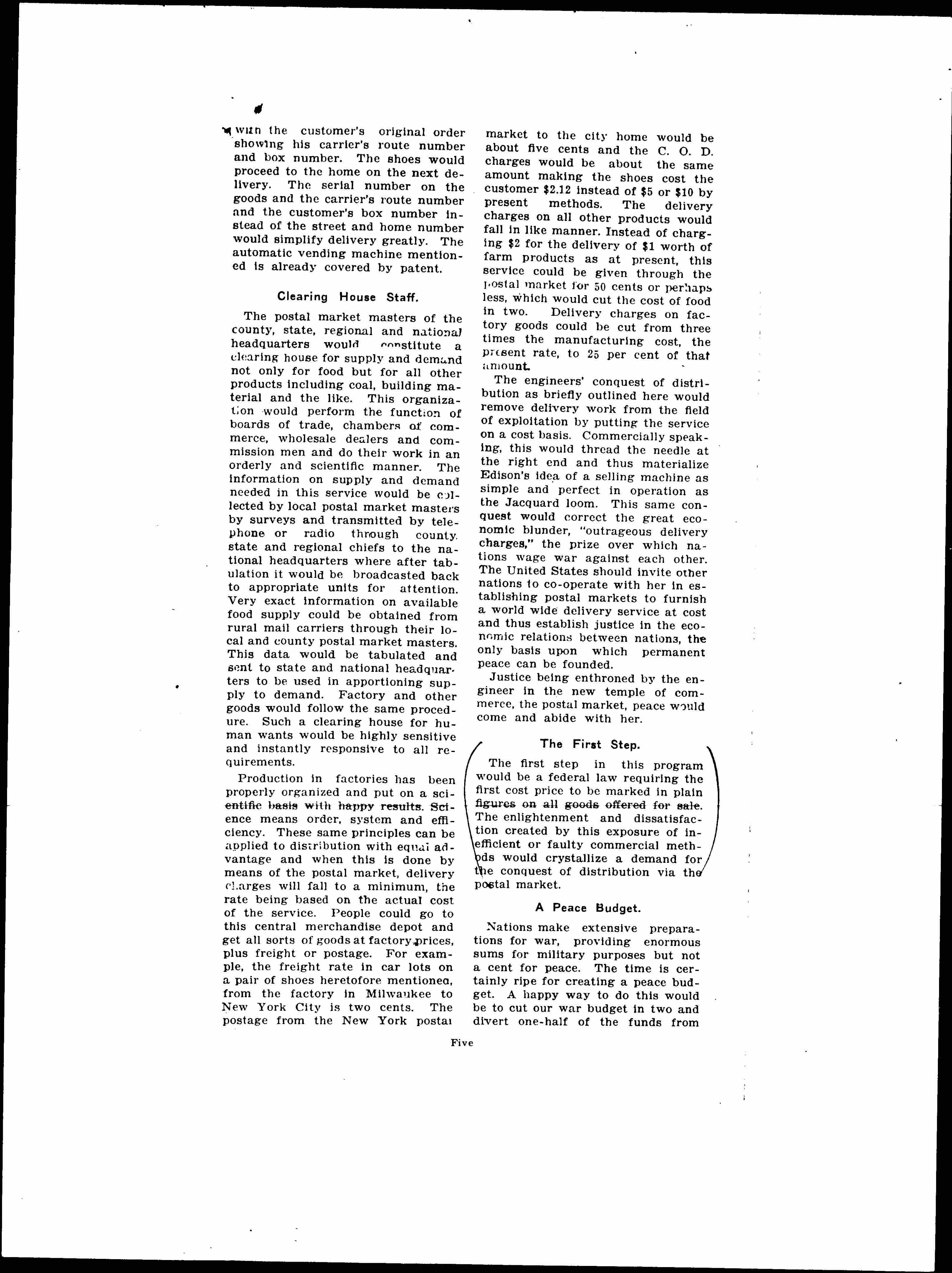 Nations make extensive preparations for war, providing enormous sums for military purposes but not a cent for peace. The time is certainly ripe for creating a peace budget. A happy way to do this would be to cut our war budget in two and divert one-half of the funds from [page 6] the manufacture of ammunition, guns, etc., to constructive purposes, viz., erecting buildings and furnishing the equipment needed to establish the postal market, peace being the aim of this work through the conquest of distribution. Ample funds would be available for this constructive work without adding even a penny to the present burden of taxation. Peace, then, would have an equal chance at least, with war, both being on the same financial footing.
