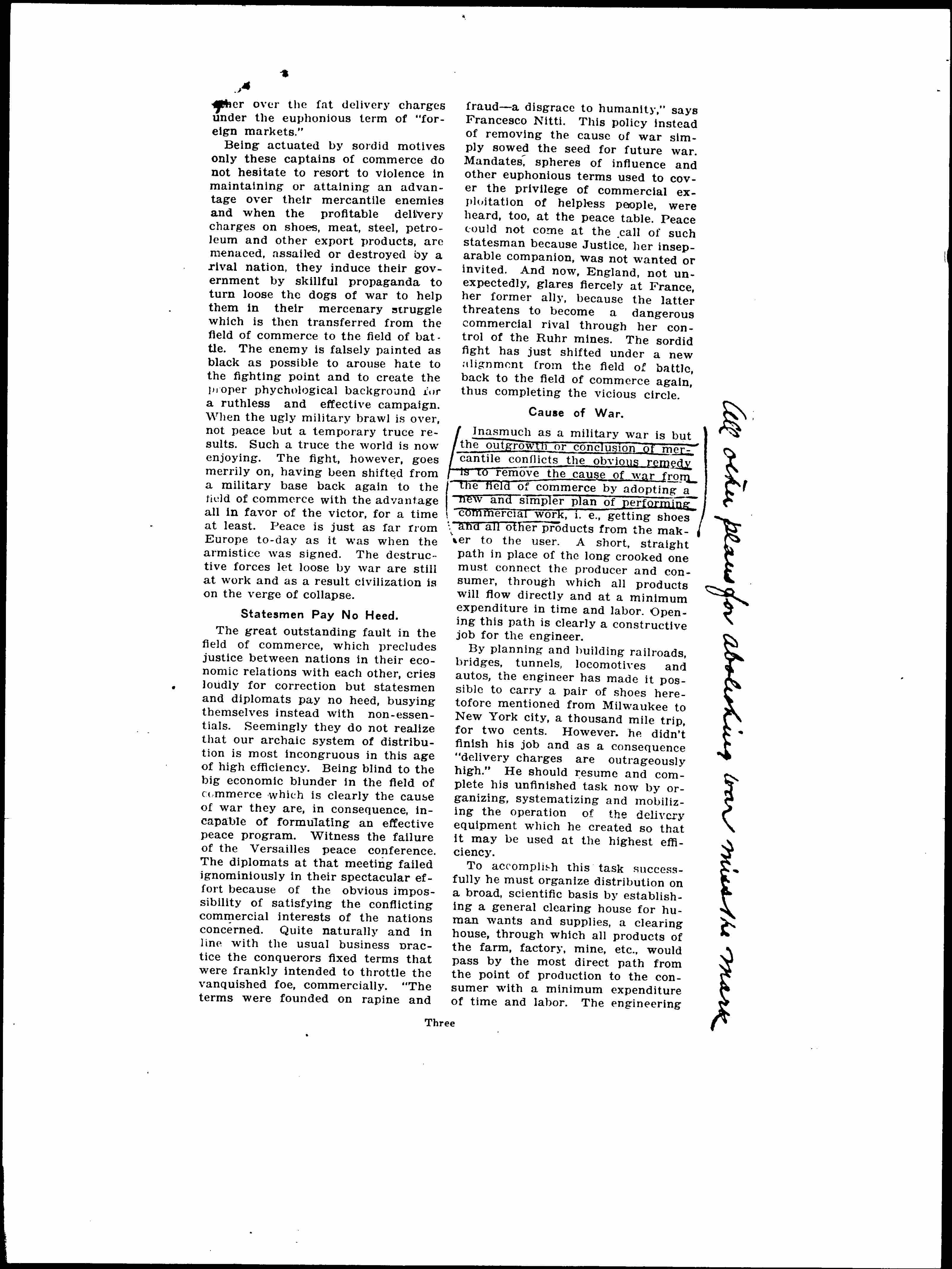 The great outstanding fault in the field of commerce, which precludes justice between nations in their economic relations with each other, cries loudly for correction but statesman and diplomats pay no heed, busying themselves instead with non-essentials. Seemingly they do not realize that our archaic system of distribution is most incongruous in this age of high efficiency. Being blind to the big economic blunder in the field of commerce which is clearly the cause of war they are, in consequence, incapable of formulating an effective peace program. Witness the failure of the Versailles peace conference. The diplomats at that meeting failed ignominiously in their spectacular effort because of the obvious impossibility of satisfying the conflicting commercial interests of the nations concerned. Quite naturally and in line with the usual business practice the conquerors fixed terms that were frankly intended to throttle the vanquished foe, commercially. "The terms were founded on rapine and fraud -- a disgrace to humanity," says Francesco Nitti. This policy instead of removing the cause of war simply sowed the seed for future war. Mandates, spheres of influence and other euphonious terms used to cover the privilege of commercial exploitation of helpless people, were heard, too, at the peace table. Peace could not come at the call of such statesman because Justice, her inseparable companion, was not wanted or invited. And now, England, not unexpectedly, glares fiercely at France, her former ally, because the latter threatens to become a dangerous commercial rival through her control of the Ruhr mines. The sordid fight has just shifted under a new alignment from the field of battle, back to the field of commerce again, this completing the vicious circle.