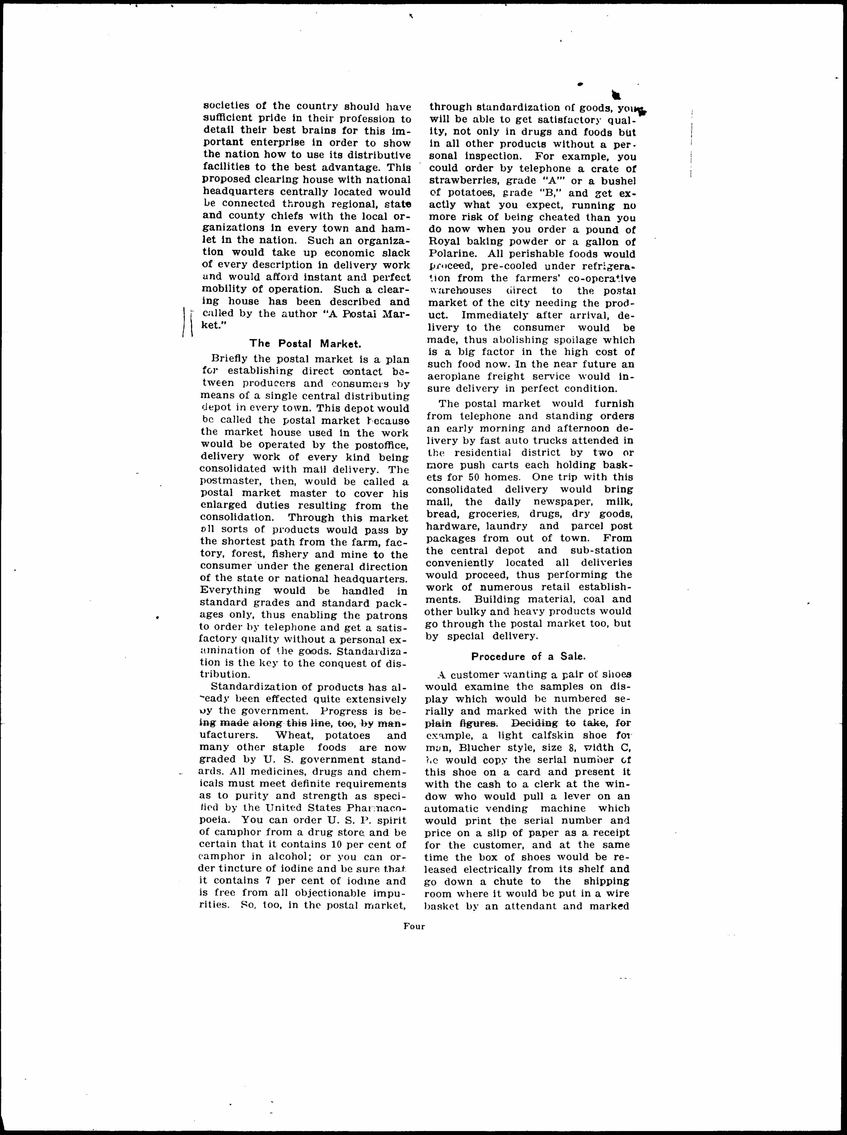 Standardization of products has already been [affected] quite extensively by the government. Progress is being made along this line, too, by manufacturers. Wheat, potatoes and many other staple foods are now graded by U.S. government standards. All medicines, drugs and chemicals must meet definite requirements as to purity and strength as specified by the United States Pharmacopoeia. You can order U.S.P. spirit of camphor from a drug store and be certain that it contains 10 [percent] of camphor in alcohol; or you can order tincture of iodine and be sure that it contains 7 [percent] of iodine and is free from all objectionable impurities. So, too, in the postal market, through standardization of goods, you will be able to get satisfactory quality, not only in drugs and foods but in all other products without a personal inspection. For example, you could order by telephone a crate of strawberries, grade "A" or a bushel of potatoes, grade "B," and get exactly what you expect, running no more risk of being cheated than you do now when you order a pound of Royal baking powder or a gallon of Polarine. All perishable foods would proceed, pre-cooled under refrigeration from the farmers' [cooperative] warehouses direct to the postal market of the city needing the product. Immediately after arrival, delivery to the consumer would be made, thus abolishing spoilage which is a big factor in the high cost of such food now. In the near future an [airplane] freight service would [ensure] delivery in perfect condition.