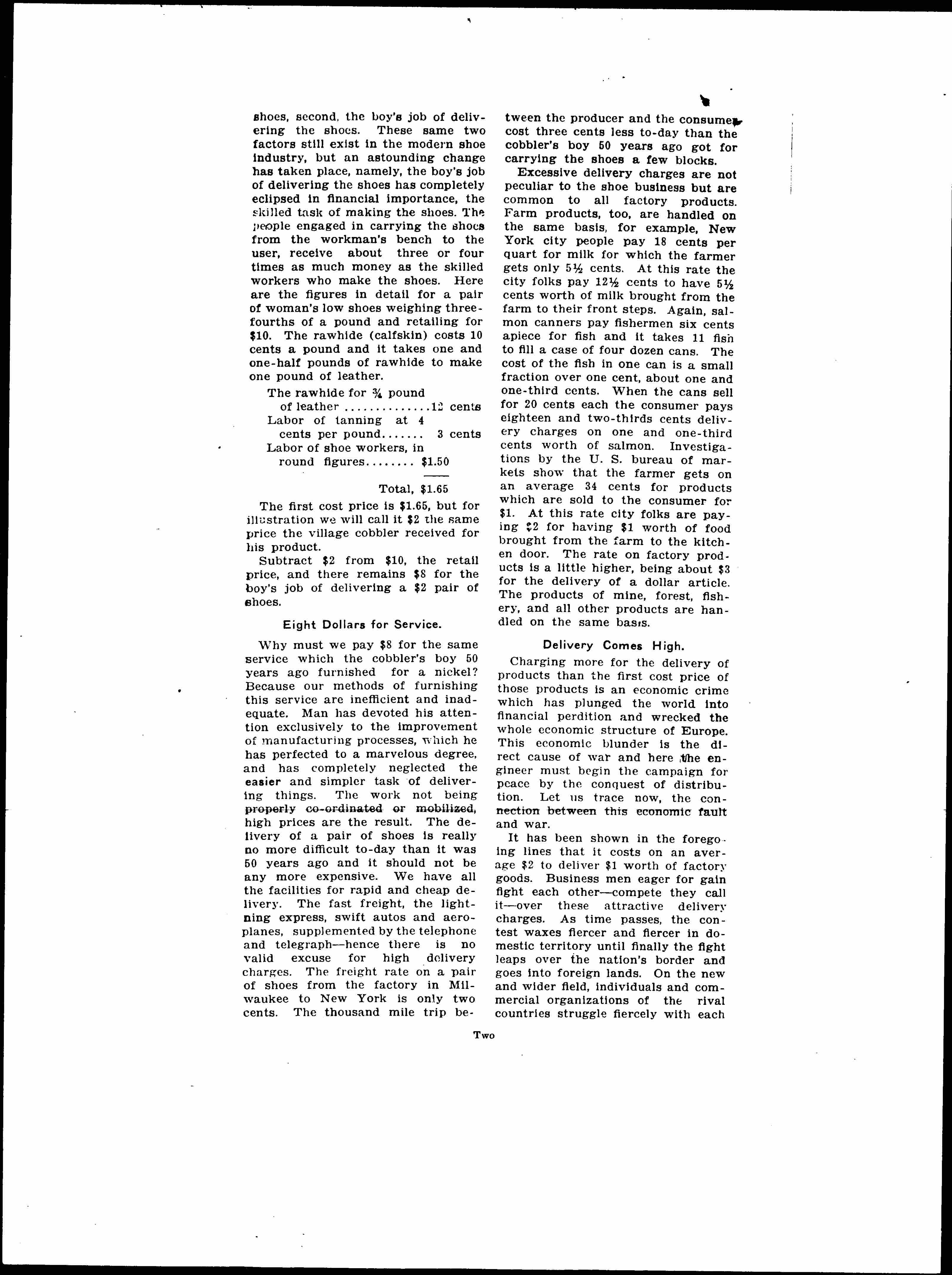 Fifty years ago the village cobbler made a pair of shoes complete for $2 in one day's time using leather from the village tan yard, a few wooden pegs and some waxed string. After supper his 10 year old son delivered the shoes a few doors or blocks away and got a five cent piece for his pay. Note well the two factors in the primitive shoe industry, first, the skilled labor of the making the [page 2] shoes, second, the boy's job of delivering the shoes. These same two factors still exist in the modern shoe industry, but an astounding change has taken place, namely, the boy's job of delivering the shoes has completely eclipsed in financial importance, the skilled task of making the shoes. The people engaged in carrying the shoes from the workman's bench to the user, receive about three or four times as much money as the skilled workers who make the shoes. Here are the figures in detail for a pair of woman's low shoes weighing three-fourths of a pound and retailing for $10. The rawhide (calfskin) costs 10 cents a pound and it takes one and one-half pounds of rawhide to make one pound of leather.