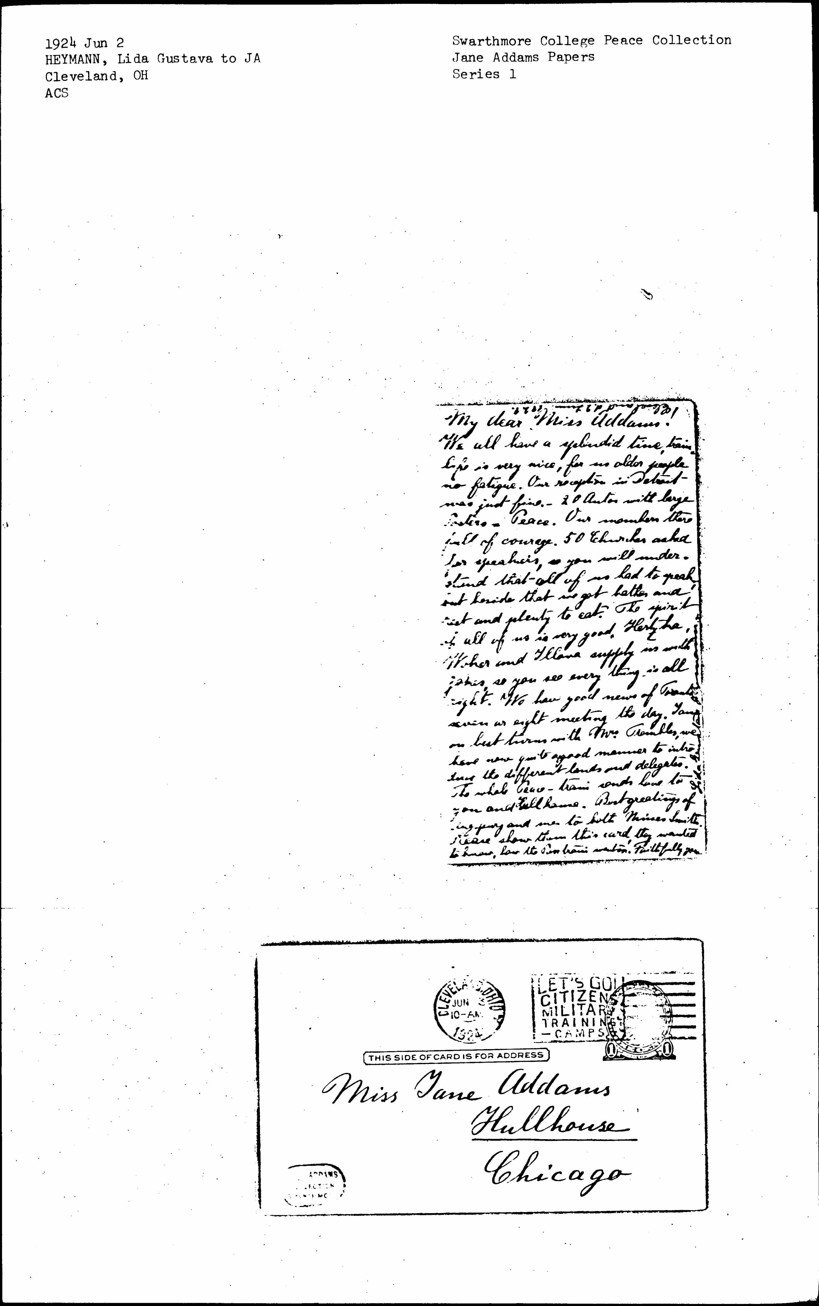 We all have a splendid time, train life is very nice, for us older people no fatigue. Our reception in Detroit was just fine. -- 20 Autos with large Posters -- Peace. Our members there full of courage. 50 Churches asked for speakers, as you will understand that all of us had to speak out beside that we got better and rest and plenty to eat. The spirit of all of us is very good. Hertzka, Woker and Illova supply us with jokes, so you see every thing is all right. We have good news of Toronto seven or eight meeting the day. I am on best terms with Mrs Trimble, we have now quite good [manner] to introduce the different lands and delegates. The whole Peace-train sends love to you and Hull House. Best greetings of Augspurg and me to both Misses Smith. Please show them this card, they wanted to know, how the Pax Train [went on]. Faithfully [yours] [page 2]
