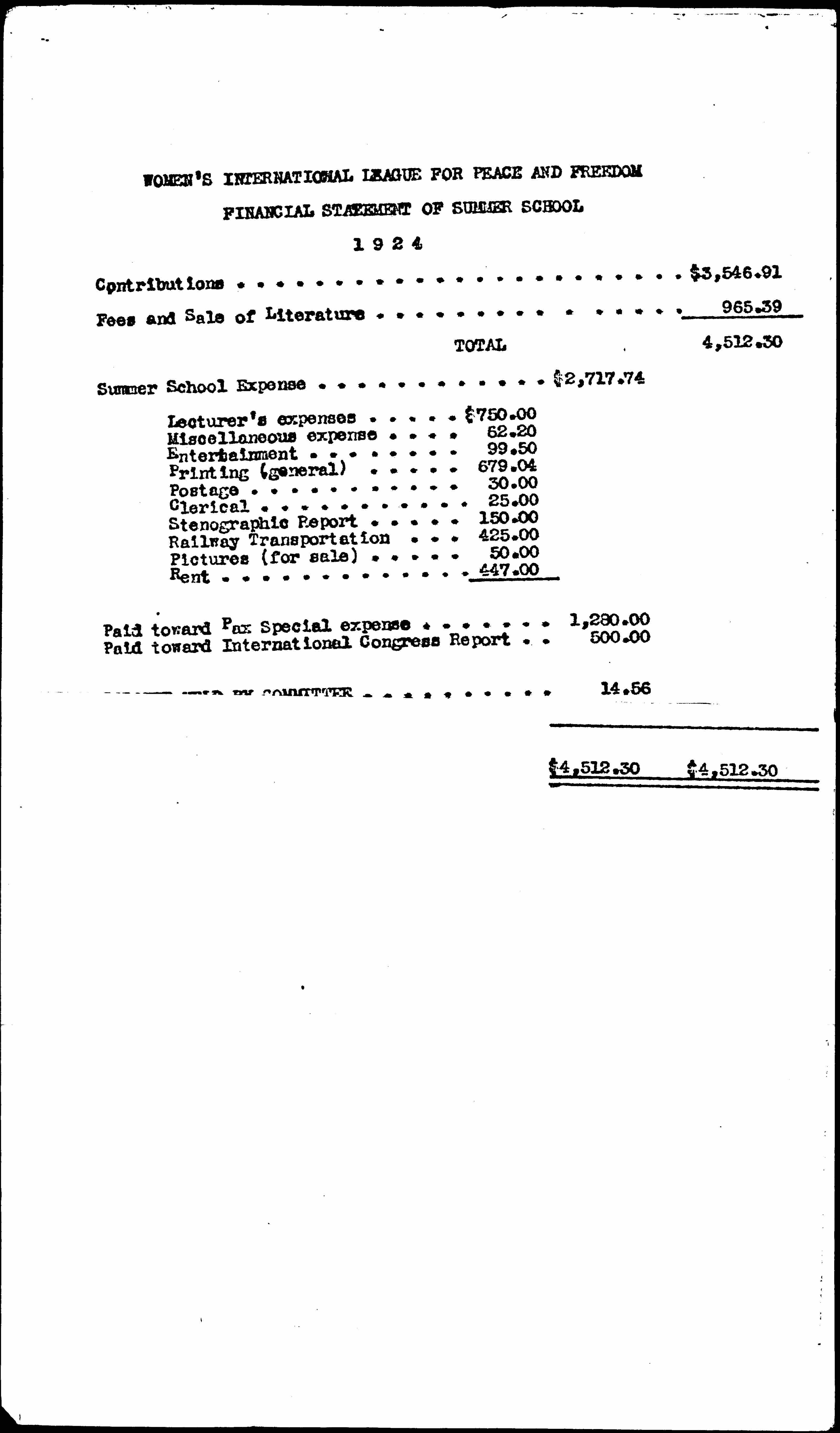 | Paid toward International Congress Report | .......... | 500.00 |