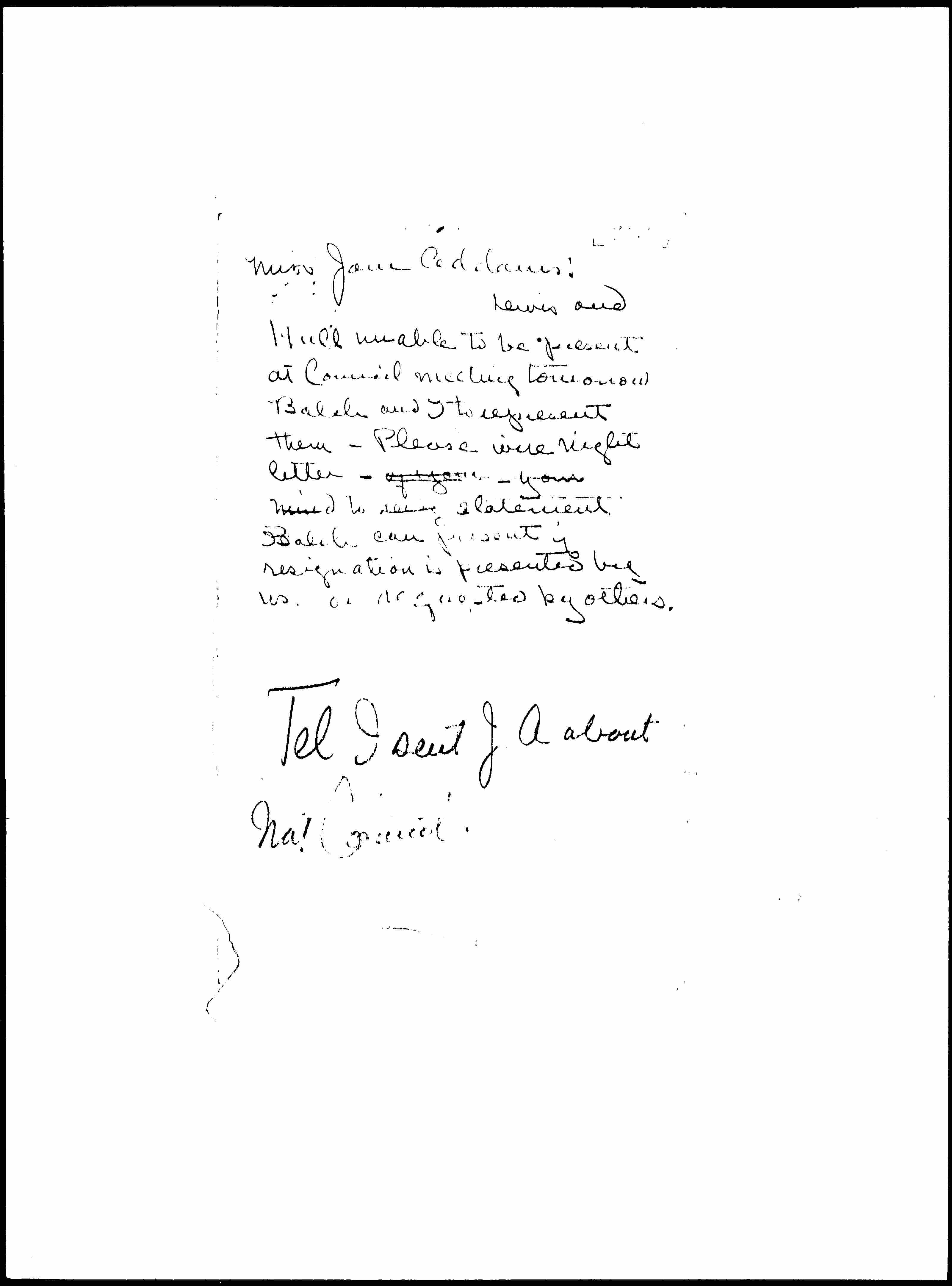 Lewis and Hull unable to be present at Council meeting tomorrow. Balch and I to represent them -- Please wire night letter -- of your -- your mind to [seeing?] statement. Balch can present if resignation is presented by us or requested by others.
