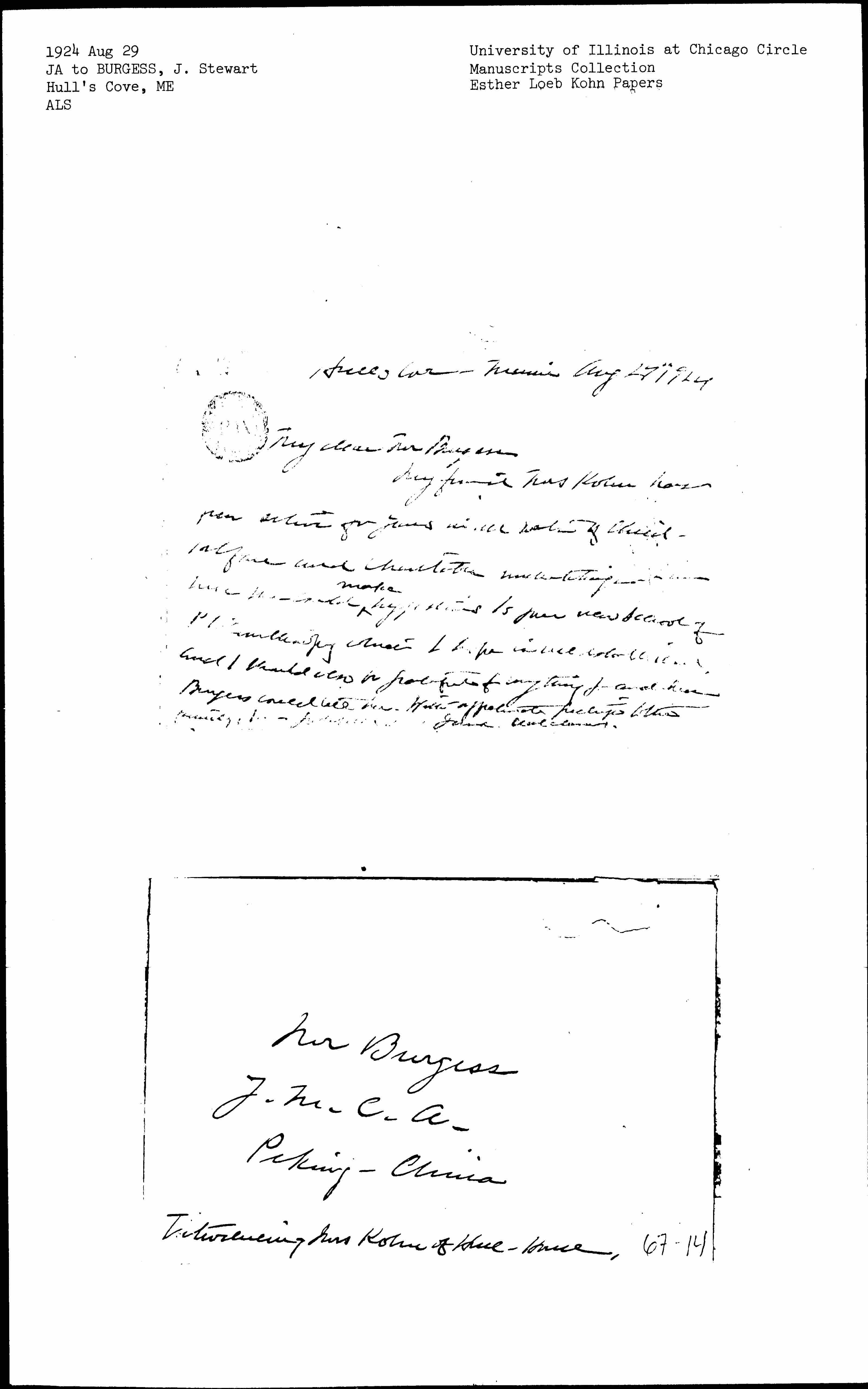 My friend Mrs Kohn has been active for years in all sorts of child welfare and charitable undertakings and I am sure she could ↑make↓ suggestions to your new school of Philanthropy which I hope is well established and I should also be grateful for anything you and Mrs Burgess could tell her. With affectionate greetings to the family, [I am faithfully yours]