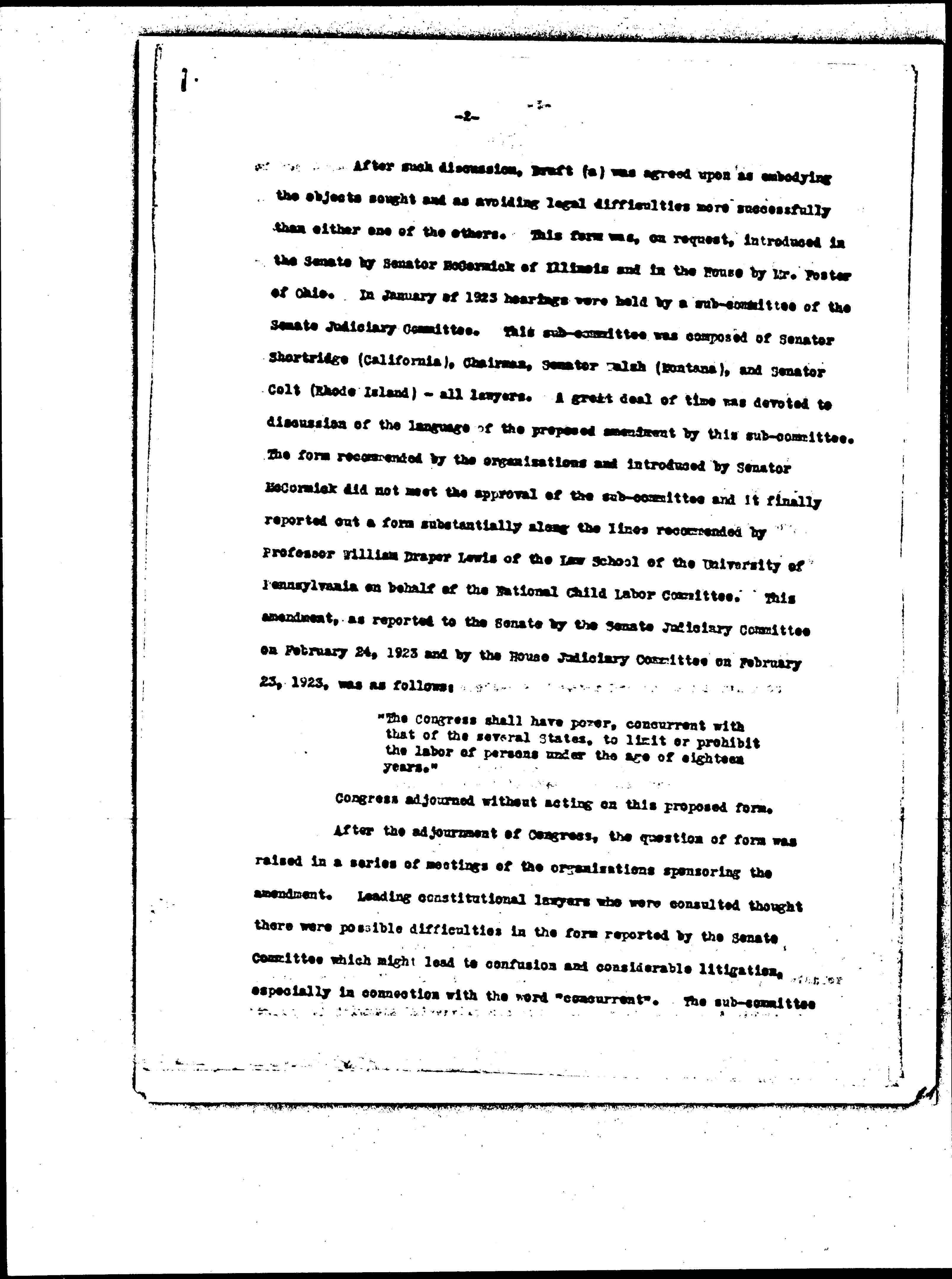 After such discussions, Draft (a) was agreed upon as embodying the objects sought and as avoiding legal difficulties more successfully than either one of the others. This form was, on request, introduced in the Senate by Senator McCormick of Illinois and in the House by Mr. Foster of Ohio. In January of 1923 hearings were held by a [subcommittee] of the Senate Judiciary Committee. This [subcommittee] was composed of Senator Shortridge (California), Chairman, Senator Walsh (Montana), and Senator Colt (Rhode Island) -- all lawyers. A great deal of time was devoted to discussion of the language of the proposed amendment by this [subcommittee]. The form recommended by the organizations and introduced by Senator McCormick did not meet the approval of the [subcommittee] and it finally reported out a form substantially along the lines recommended by Professor William Draper Lewis of the Law School of the University of Pennsylvania on behalf of the National Child Labor Committee. This amendment, as reported to the Senate by the Senate Judiciary Committee on February 24, 1923 and by the House Judiciary Committee on February 23, 1923, was as follows:
