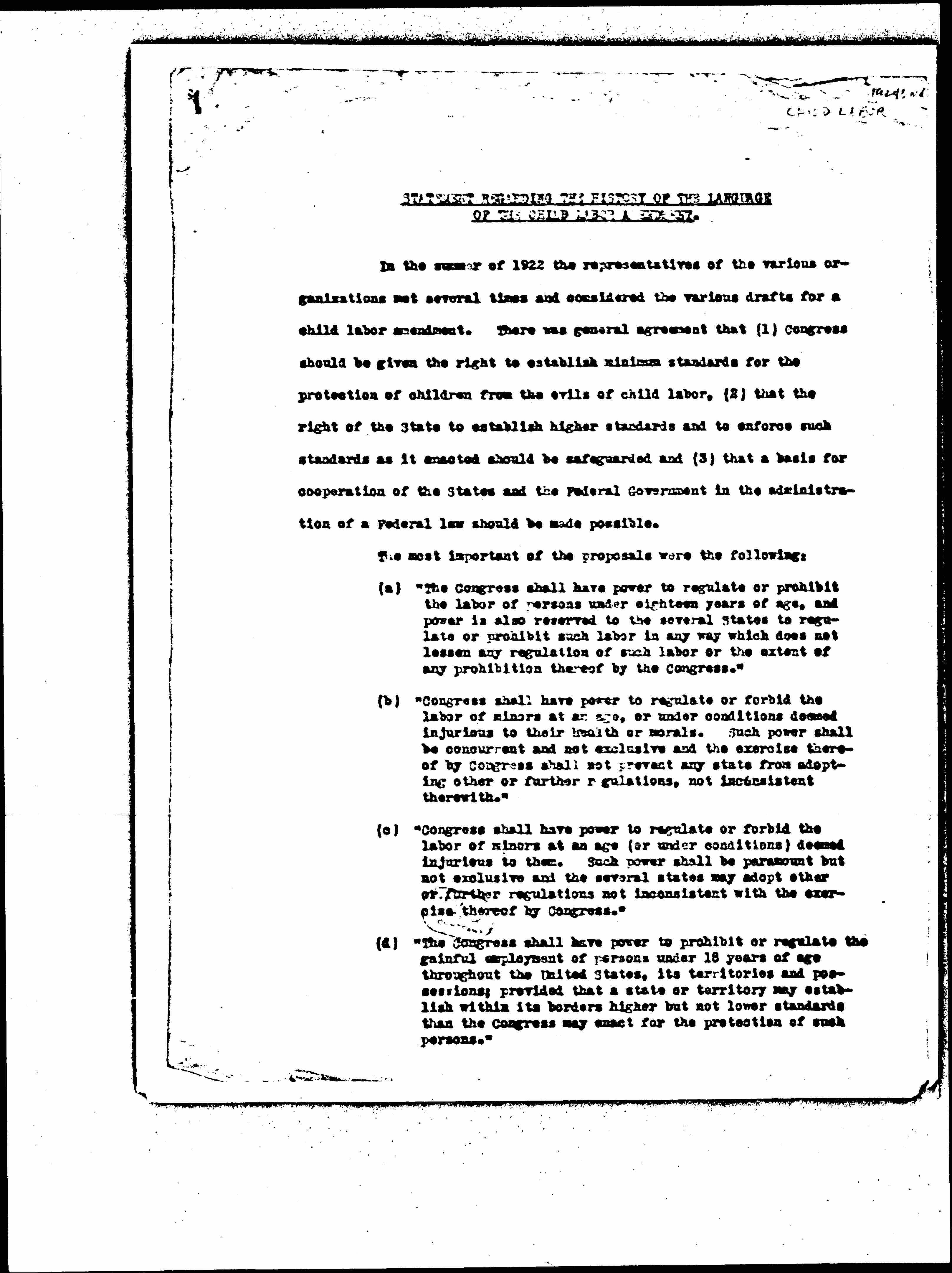 STATEMENT REGARDING THE HISTORY OF THE LANGUAGE OF THE CHILD LABOR AMENDMENT.