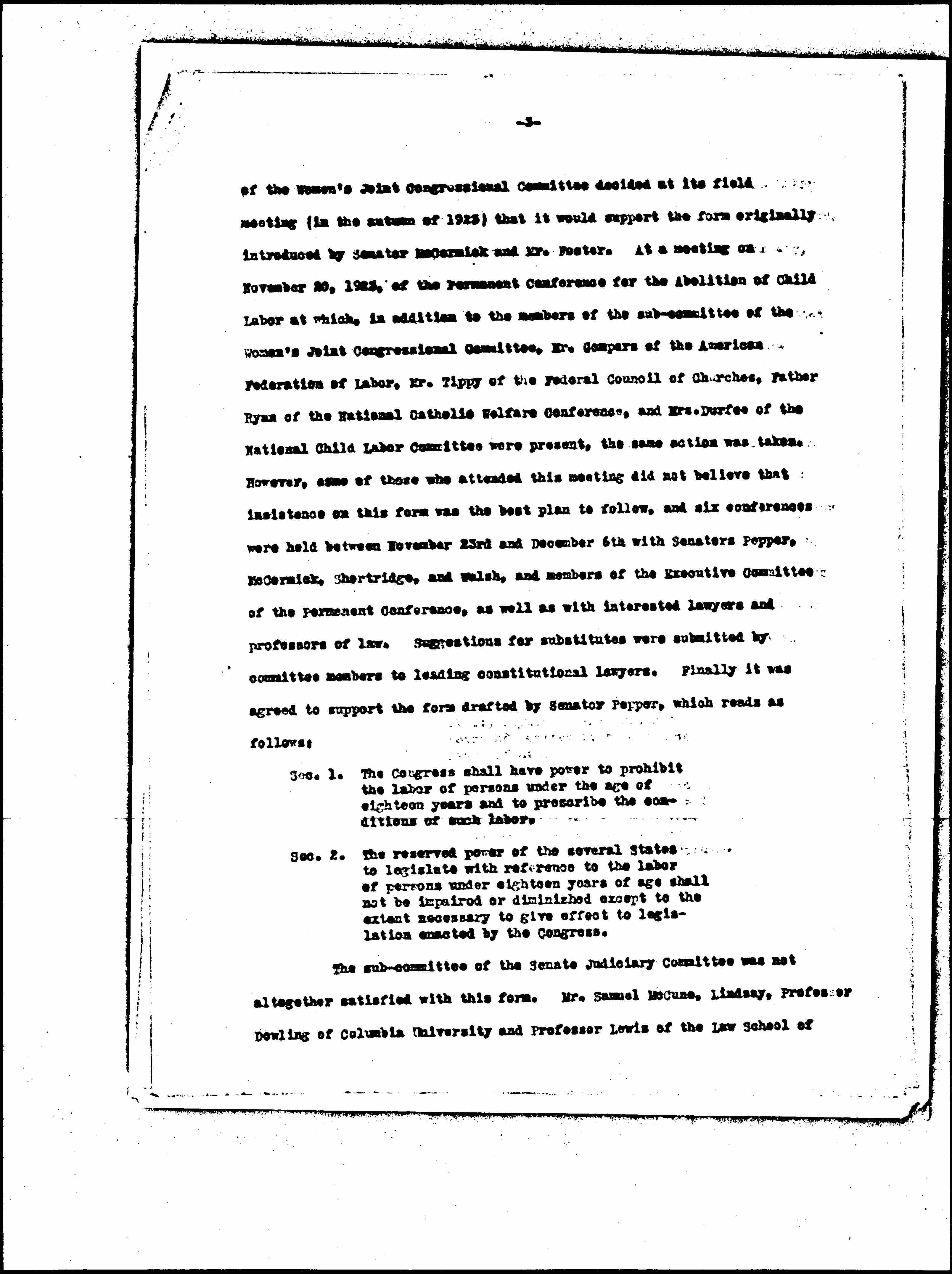 After the adjournment of Congress, the question of form was raised in a series of meetings of the organizations sponsoring the amendment. Leading constitutional lawyers who were consulted thought there were possible difficulties in the form reported by the Senate Committee which might lead to confusion and considerable litigation, especially in connection with the word "concurrent." The [subcommittee] [page 3] of the Women's Joint Congressional Committee decided at its field meeting (in the autumn of 1923) that it would support the form originally introduced by Senator McCormick and Mr. Foster. At a meeting on November 20, 1923, of the Permanent Conference for the Abolition of Child Labor at which, in addition to the members of the [subcommittee] of the Women's Joint Congressional Committee, Mr. Gompers of the American Federation of Labor, Mr. Tippy of the Federal Council of Churches, Father Ryan of the National Catholic Welfare Conference, and Mrs. Durfee of the National Child Labor Committee were present, the same action was taken. However, some of those who attended this meeting did not believe that insistence on this form was the best plan to follow, and six conferences were held between November 23rd and December 6th with Senators Pepper, McCormick, Shortridge, and Walsh, and members of the Executive Committee of the Permanent Conference, as well as with interested lawyers and professors of law. Suggestions for substitutes were submitted by committee members to leading constitutional lawyers. Finally it was agreed to support the form drafted by Senator Pepper, which reads as follows: