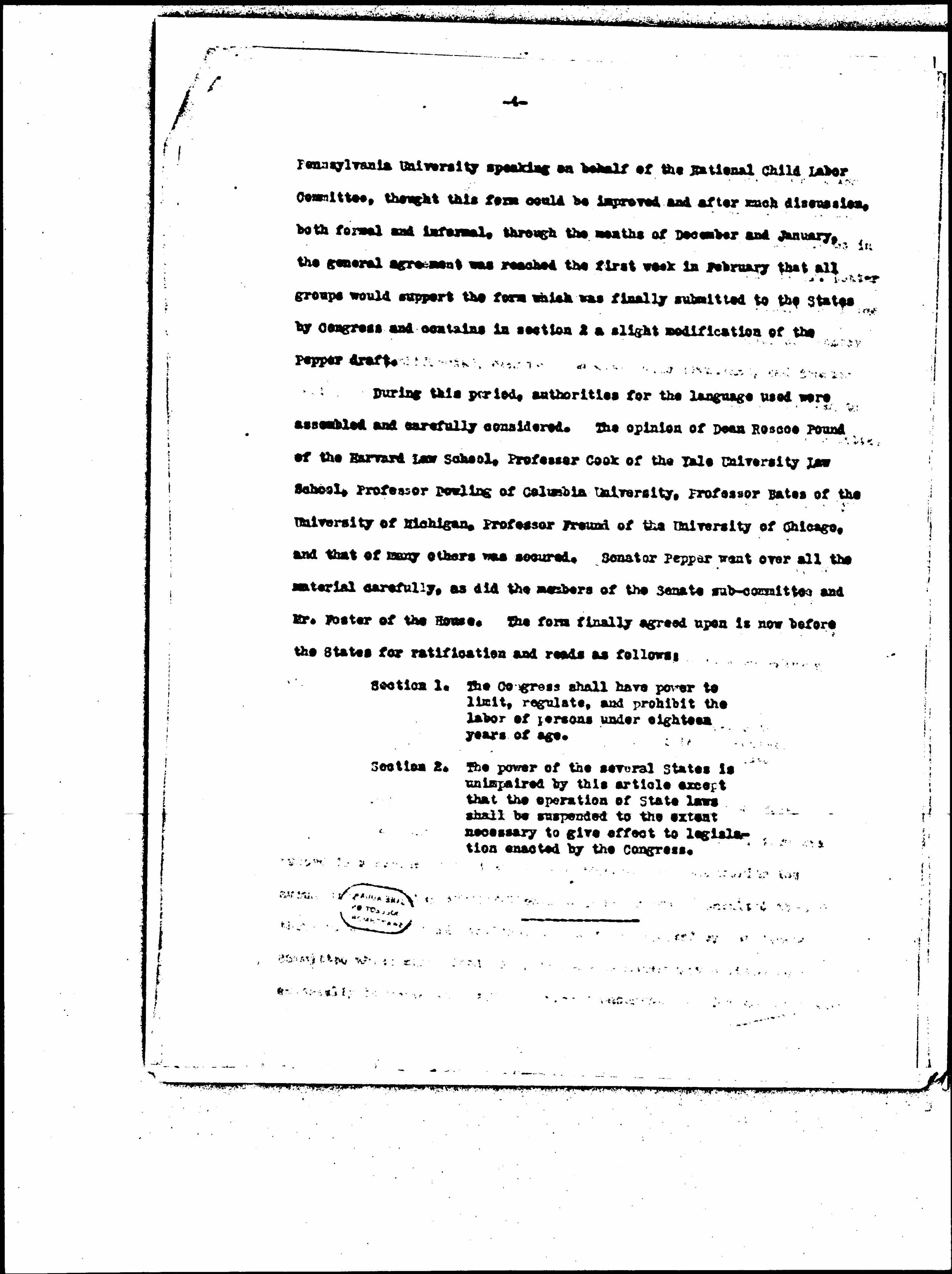 During this period, authorities for the language used were assembled and carefully considered. The opinion of Dean Roscoe Pound of the Harvard Law School, Professor Cook of the Yale University Law School, Professor Dowling of Columbia University, Professor Bates of the University of Michigan, Professor Freund of the University of Chicago, and that of many others was secured. Senator Pepper went over all the material carefully, as did the members of the Senate [subcommittee] and Mr. Foster of the House. The form finally agreed upon is now before the States for ratification and reads as follows: