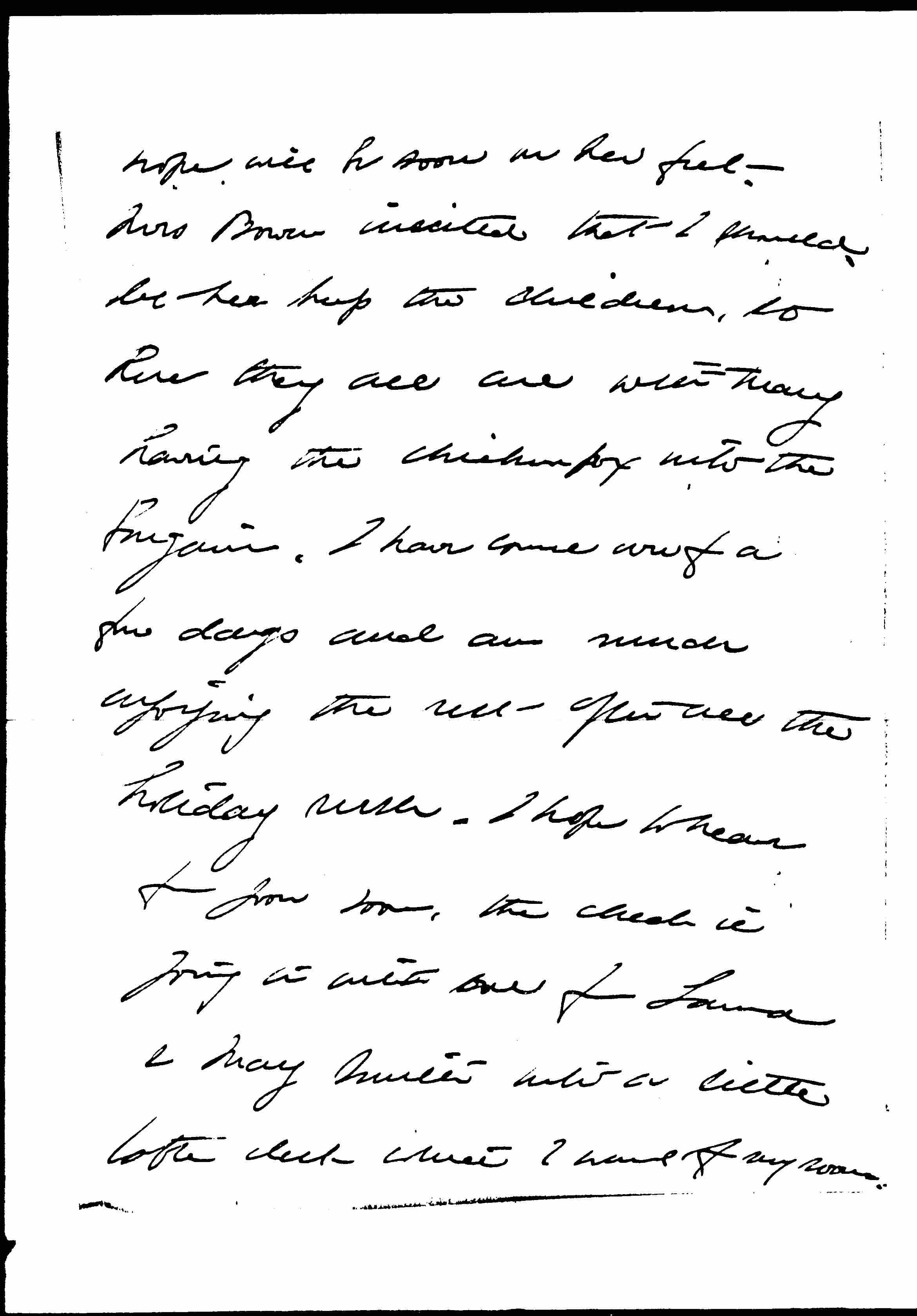 Mrs Bowen insisted that I should let her keep the children, so here they all are with Mary having the chickenpox into the bargain. I have come over for a few days and am much enjoying the rest after all the holiday rush. I hope to hear from you soon, the check is going in with one from Laura & Mary Smith into a little table desk that I want for my room. [page 3]