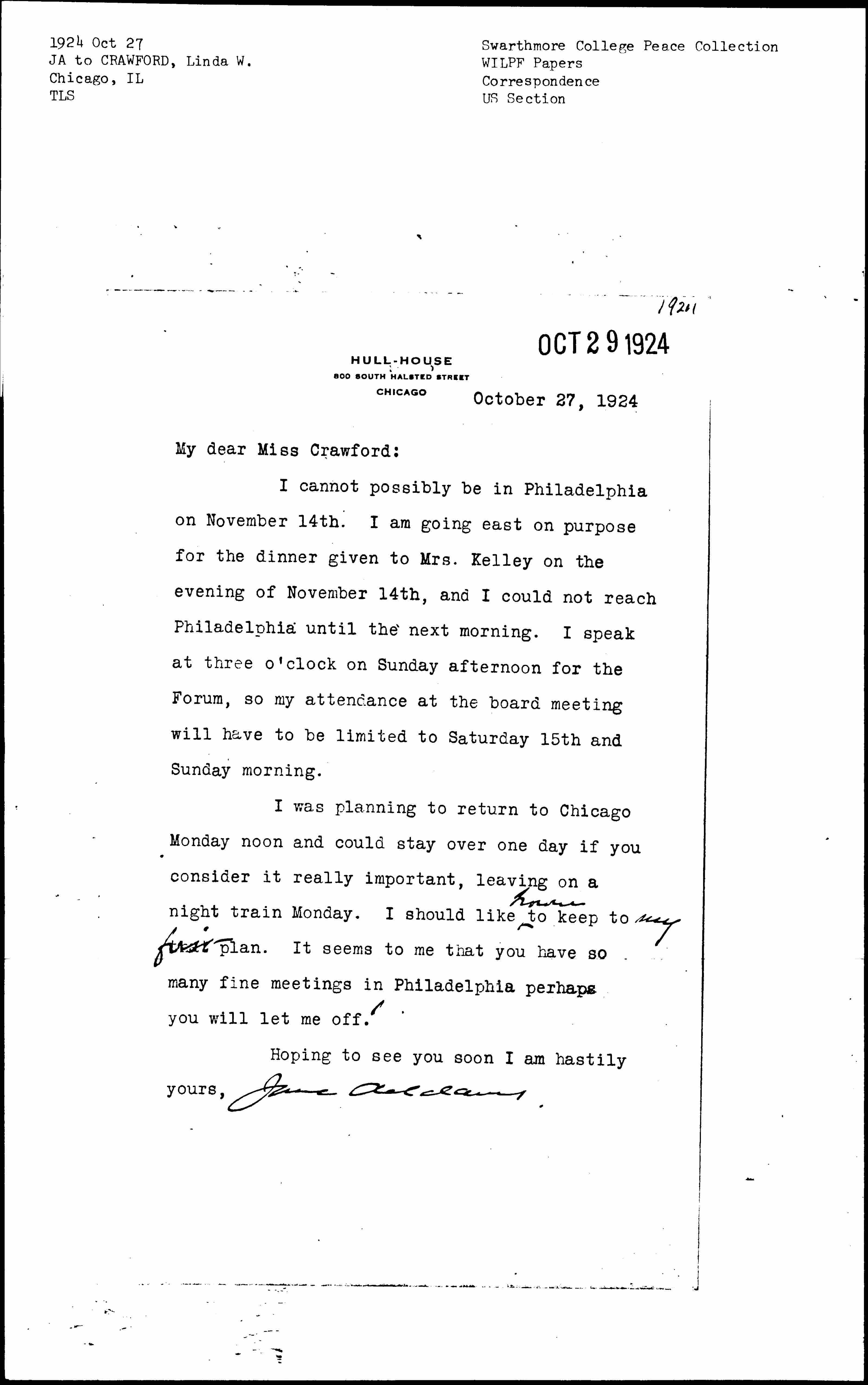 Hoping to see you soon I am hastily yours, Jane Addams. [signed]