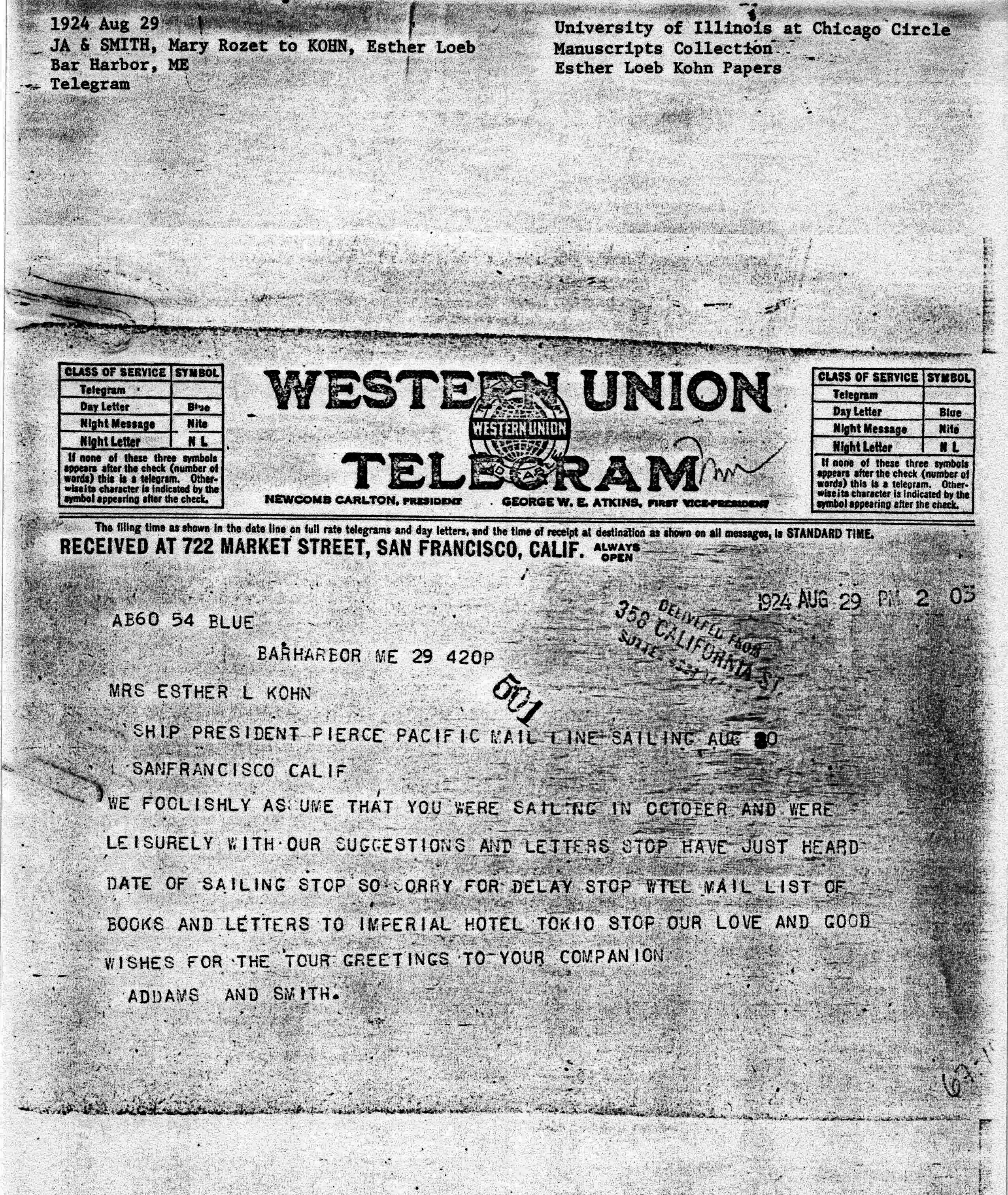 WE FOOLISHLY ASSUME THAT YOU WERE SAILING IN OCTOBER AND WERE LEISURELY WITH OUR SUGGESTIONS AND LETTERS. HAVE JUST HEARD DATE OF SAILING. SO SORRY FOR DELAY. WILL MAIL LIST OF BOOKS AND LETTERS TO IMPERIAL HOTEL [TOKYO]. OUR LOVE AND GOOD WISHES FOR THE TOUR GREETINGS TO YOUR COMPANION