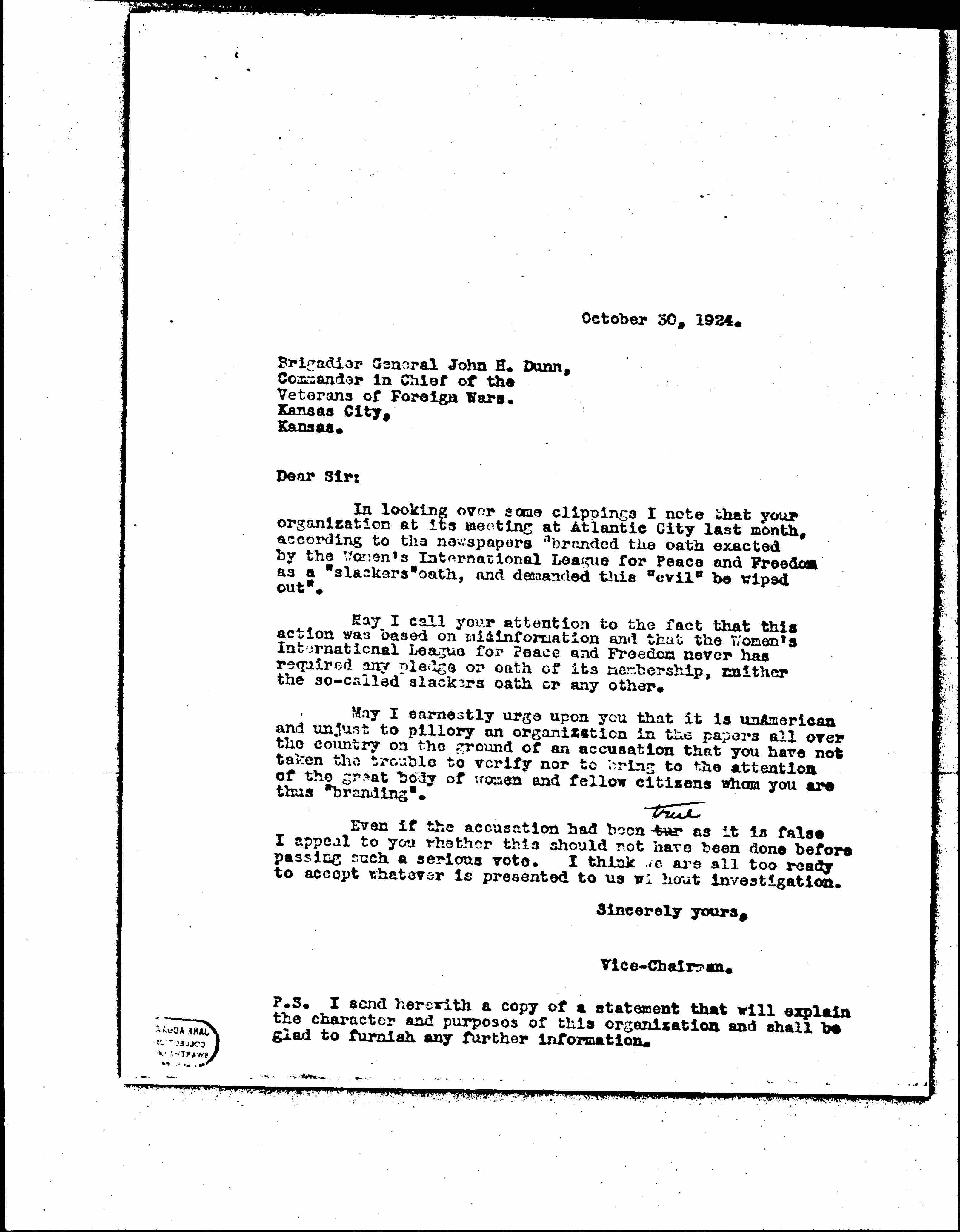 In looking over some clippings I note that your organization at its meeting at Atlantic City last month, according to the newspaper "branded the oath exacted by the Women's International League for Peace and Freedom as a 'slackers' oath, and demanded this 'evil' be wiped out."