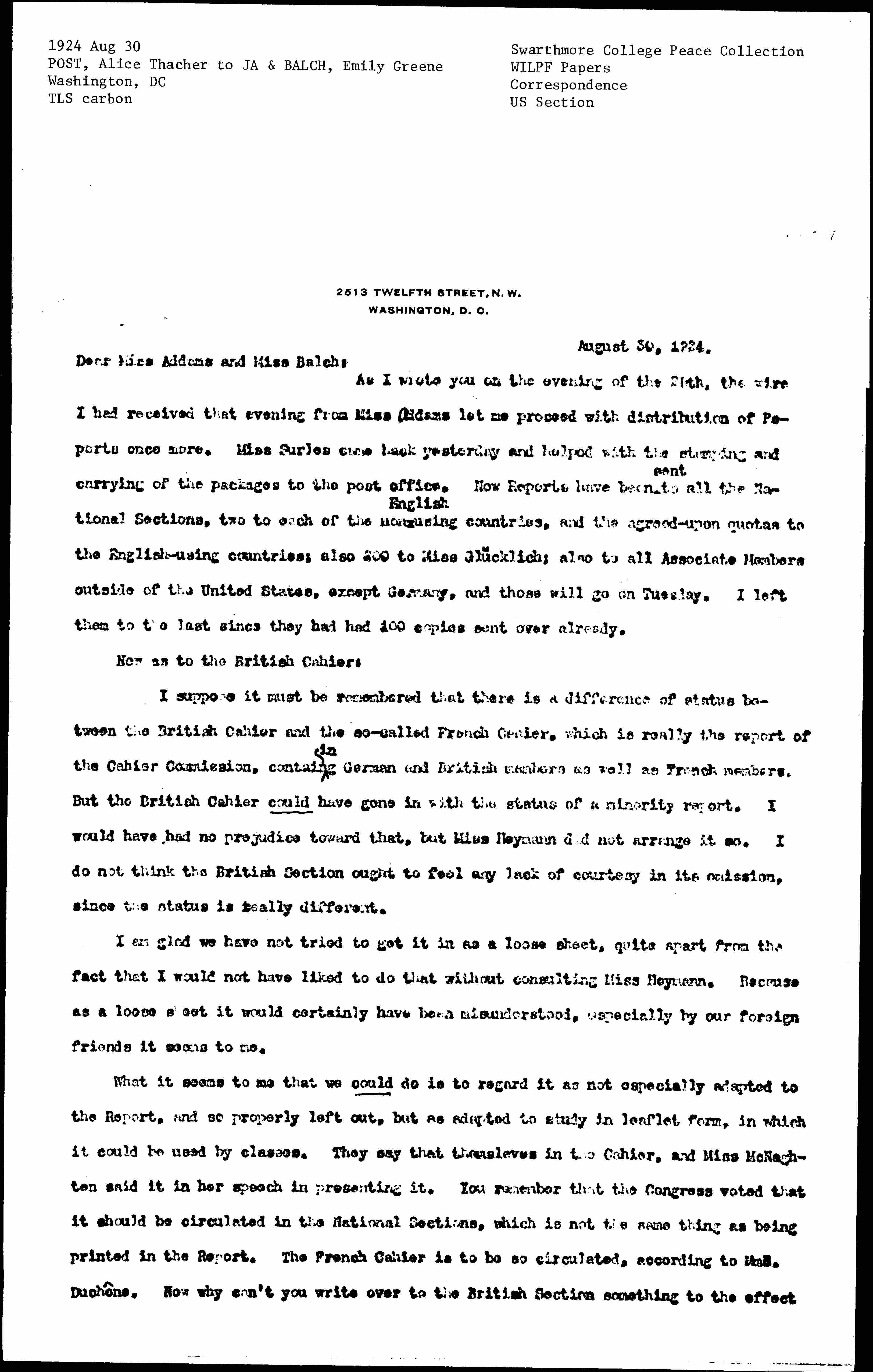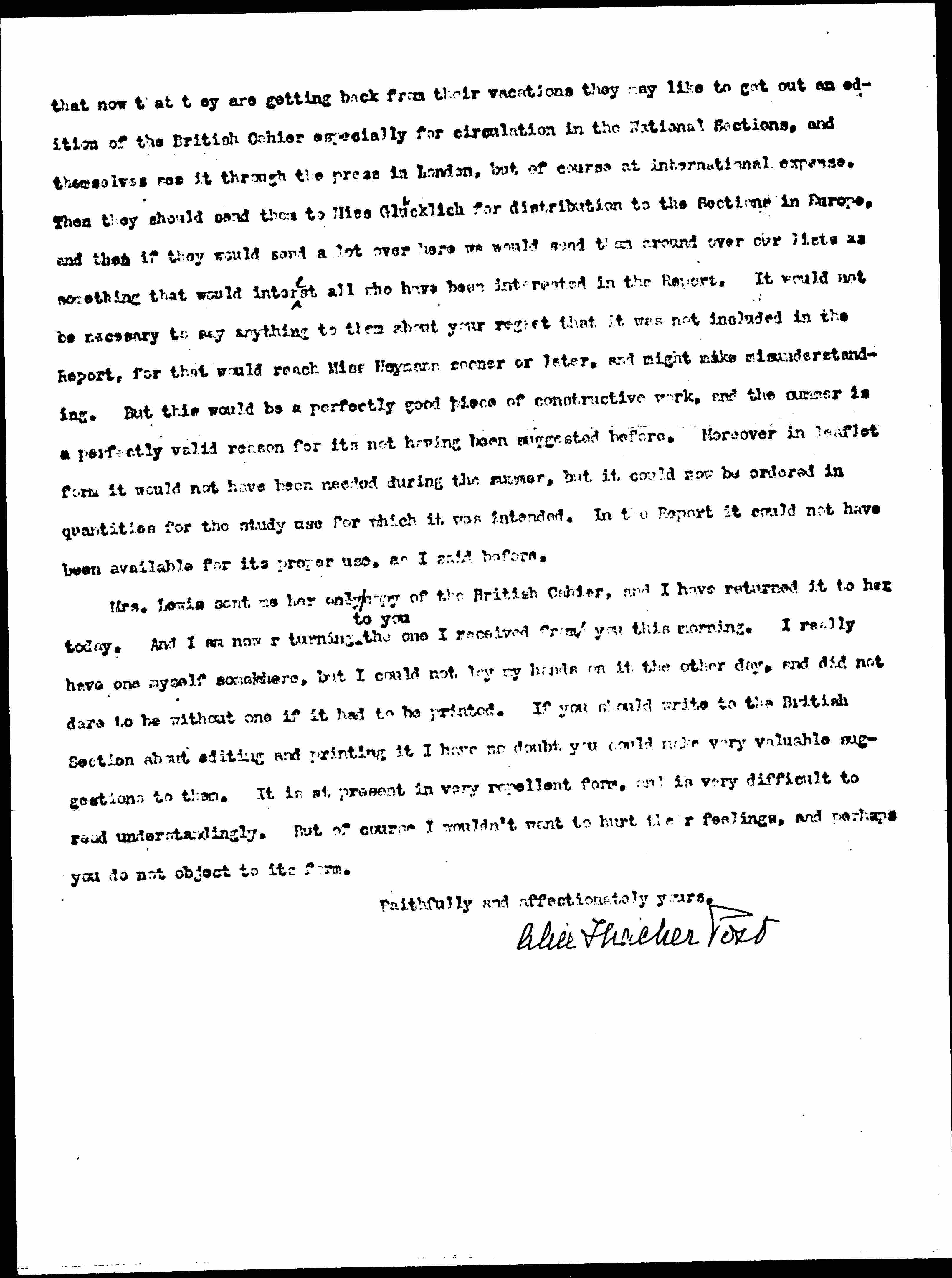 What it seems to me that we could do is regard it as not especially adapted to the Report, and so properly left out, but as adapted to study in leaflet form, in which it could be used by classes. They say that themselves in the Cahier, and Miss [Macnaghten] said it in her speech in presenting it. You remember that the Congress voted that it should be circulated in the National Sections, which is not the same thing as being printed in the Report. The French Cahier is to be so circulated, according to Mme. Duchêne. Now why can't you write over to the British Section something to the effect [page 2] that now that they are getting back from their vacations they may like to get out an edition of the British Cahier especially for circulation in the National Sections, and themselves see it through the press in London, but of course at international expense. Then they should send them to Miss Glücklich for distribution to the Sections in Europe, and then if they would send a lot over here we would send them around over our lists as something that would interest all who have been interested in the Report. It would not be necessary to say anything to them about your regret that it was not included in the Report, for that would reach Miss Heymann sooner or later, and might make misunderstanding. But this would be a perfectly good piece of constructive work, and the summer is a perfectly valid reason for its not having been suggested before. Moreover in leaflet form it would not have been needed during the summer, but it could now be ordered in quantities for the study use for which it was intended. In the Report could not have been available for its proper use, as I said before.