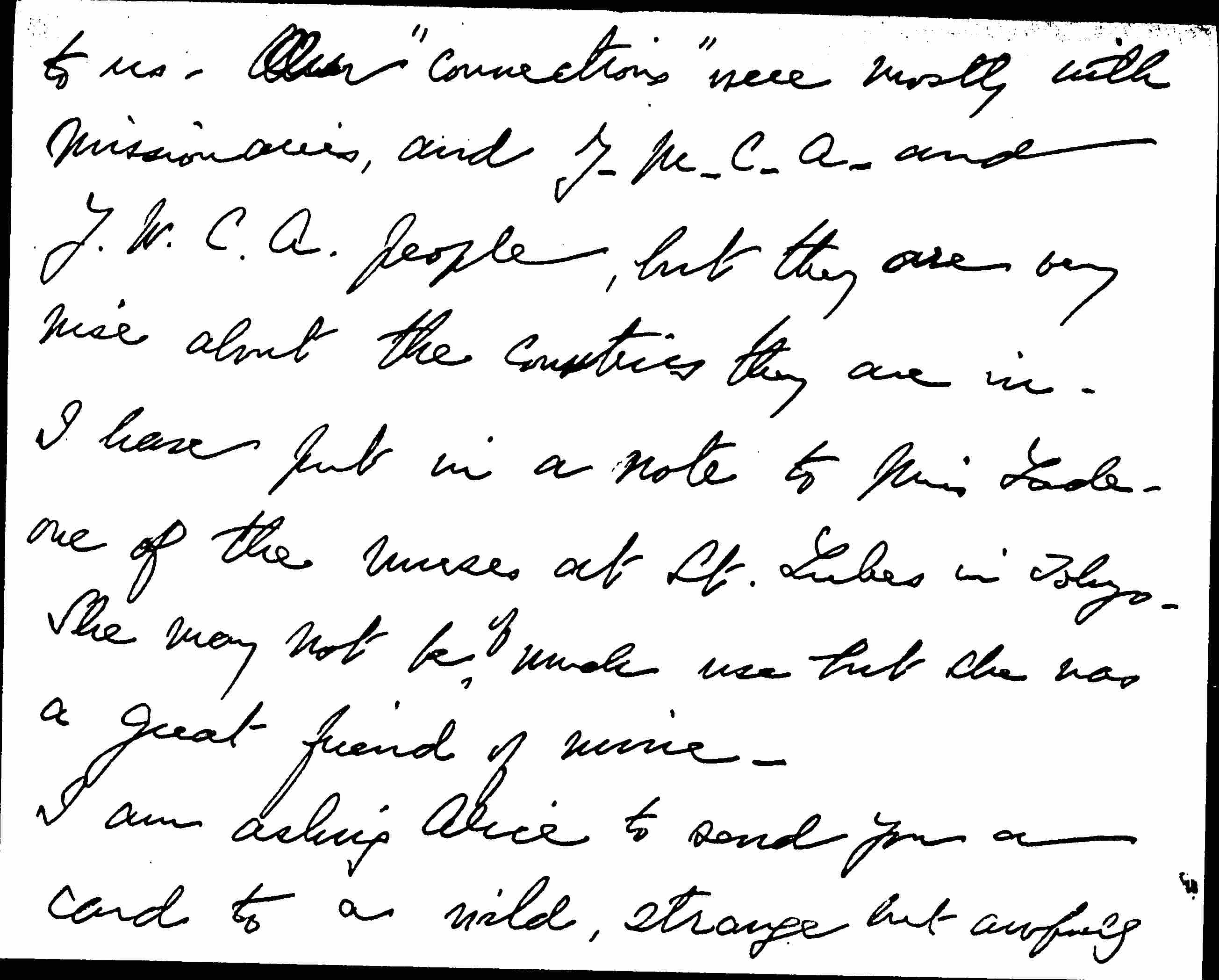 You must be sure to find the Burgesses at the Y.W.C.A. They know ↑a great deal↓ about conditions in Peking and were awfully kind [page 3] to us. Our "connections" were mostly with missionaries, and Y.W.C.A. and Y.W.C.A. people, but they are very wise about the countries they are in. I have put in a note to Miss Lade, one of the nurses at St. Luke's in Tokyo. She may not be ↑of↓ much use but she was a great friend of mine.