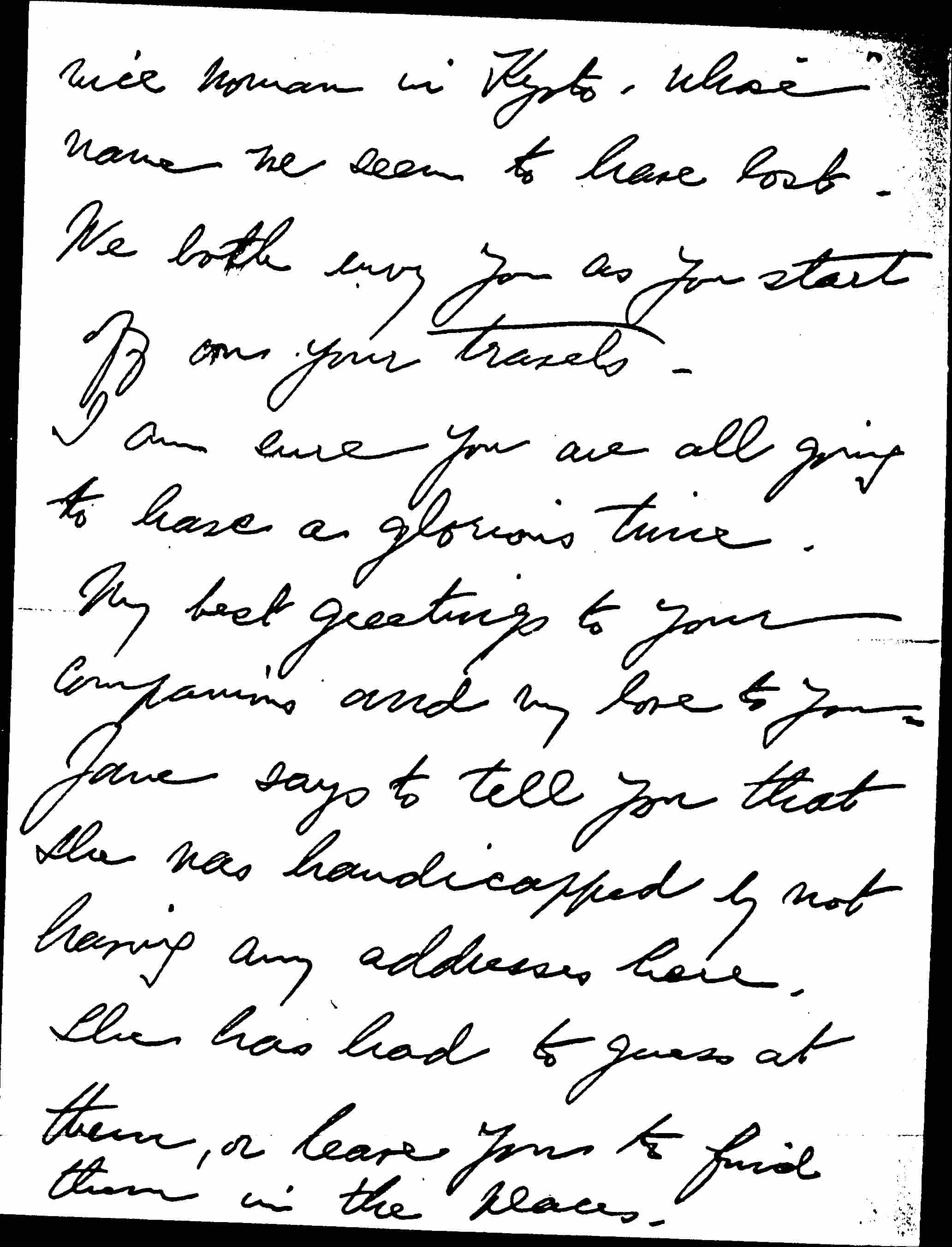 I am asking Alice to send you a card to a wild, strange but awfully [page 4] nice woman in Kyoto, whose name we seem to have lost. We both envy you as you start off on your travels.