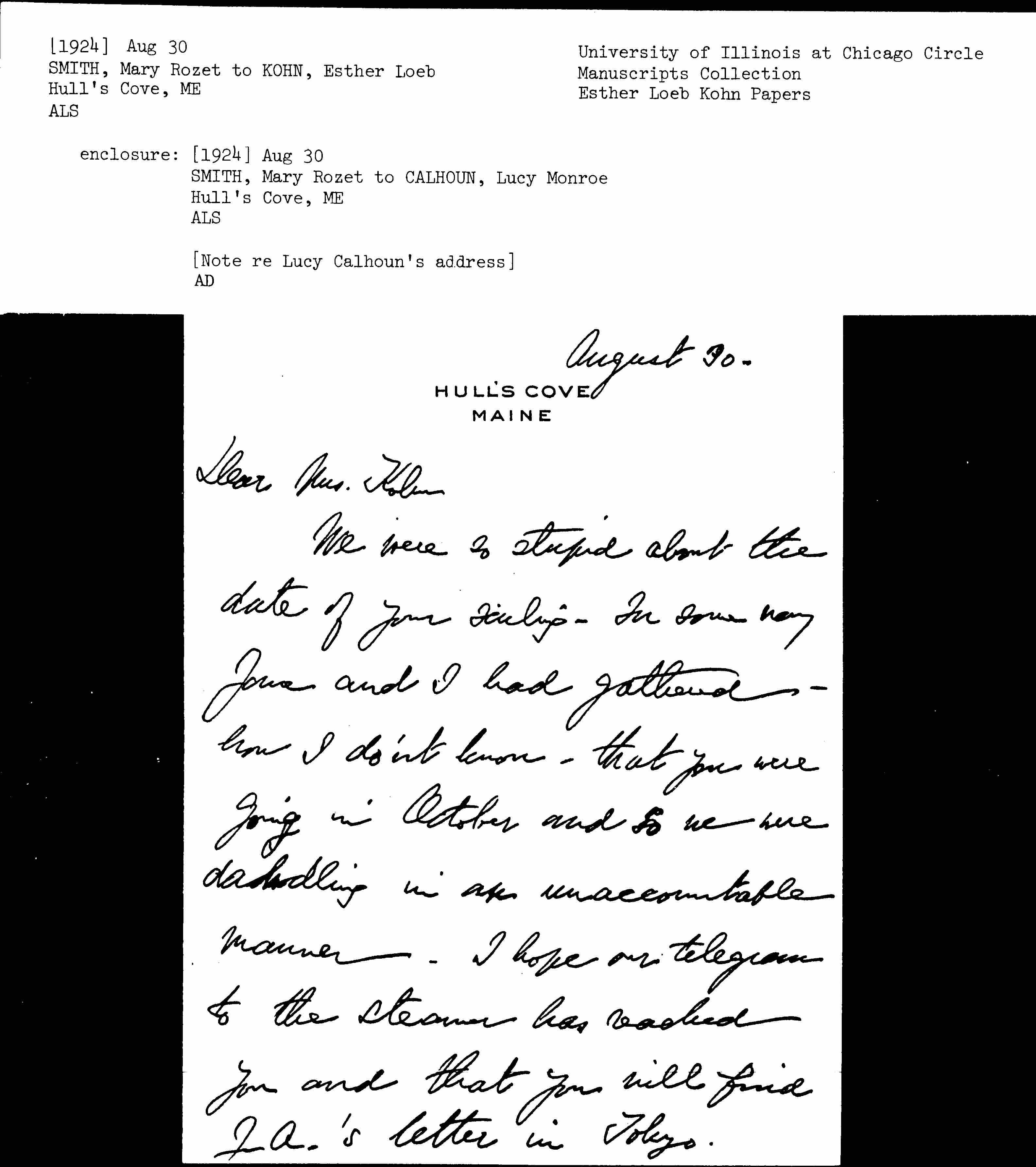 We were so stupid about the date of your sailing. In some way Jane and I had gathered -- how I don't know -- that you were going in October and so we were [dawdling] in an unaccountable manner. I hope our telegram to the steamer has reached you and that you will find J. A.'s letter in Tokyo. [page 2]
