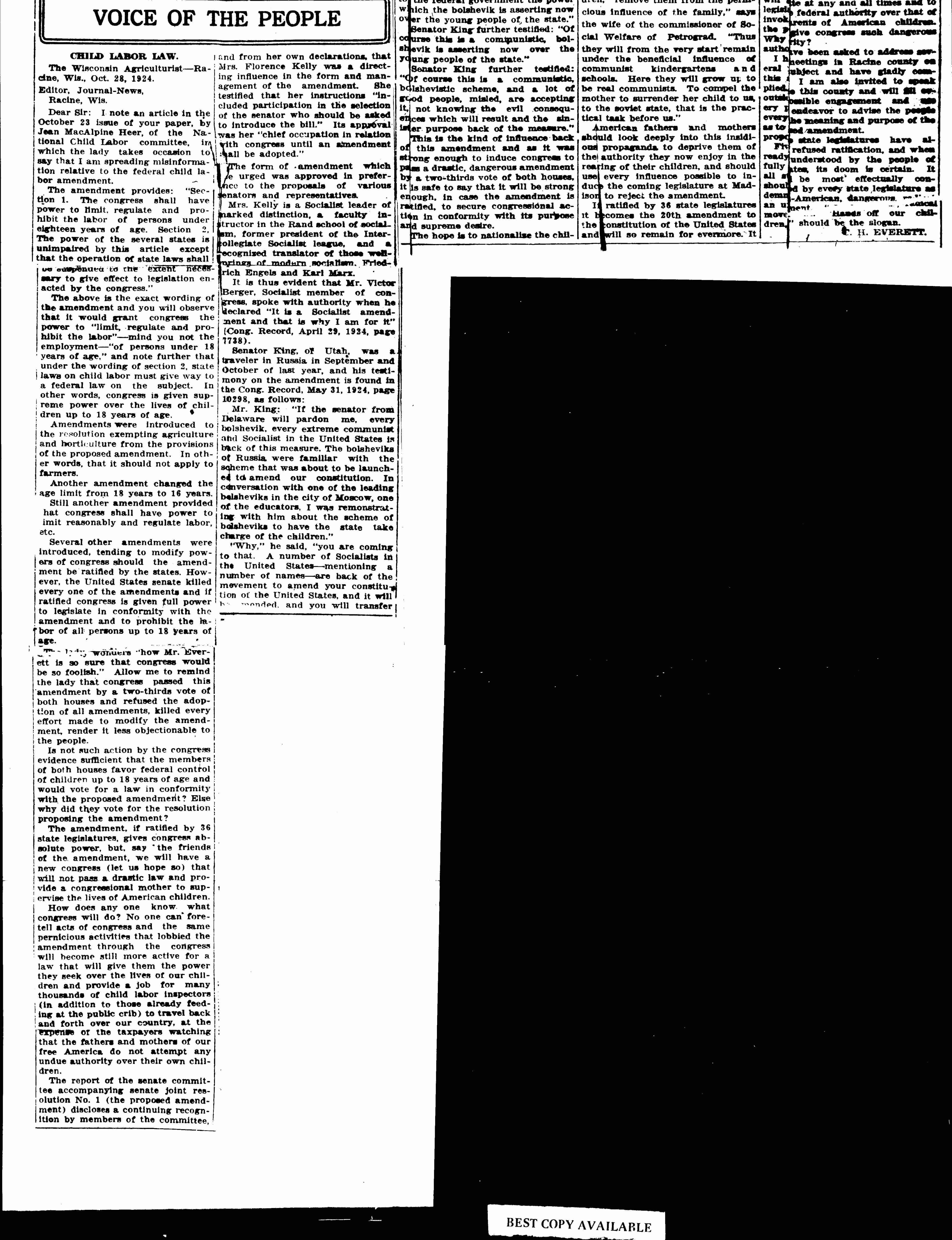 Dear Sir: I note an article in the October 23 issue of your paper, by Jean MacAlpine Heer, of the National Child Labor Committee, in which the lady takes occasion to say that I am spreading misinformation relative to the federal child labor amendment.