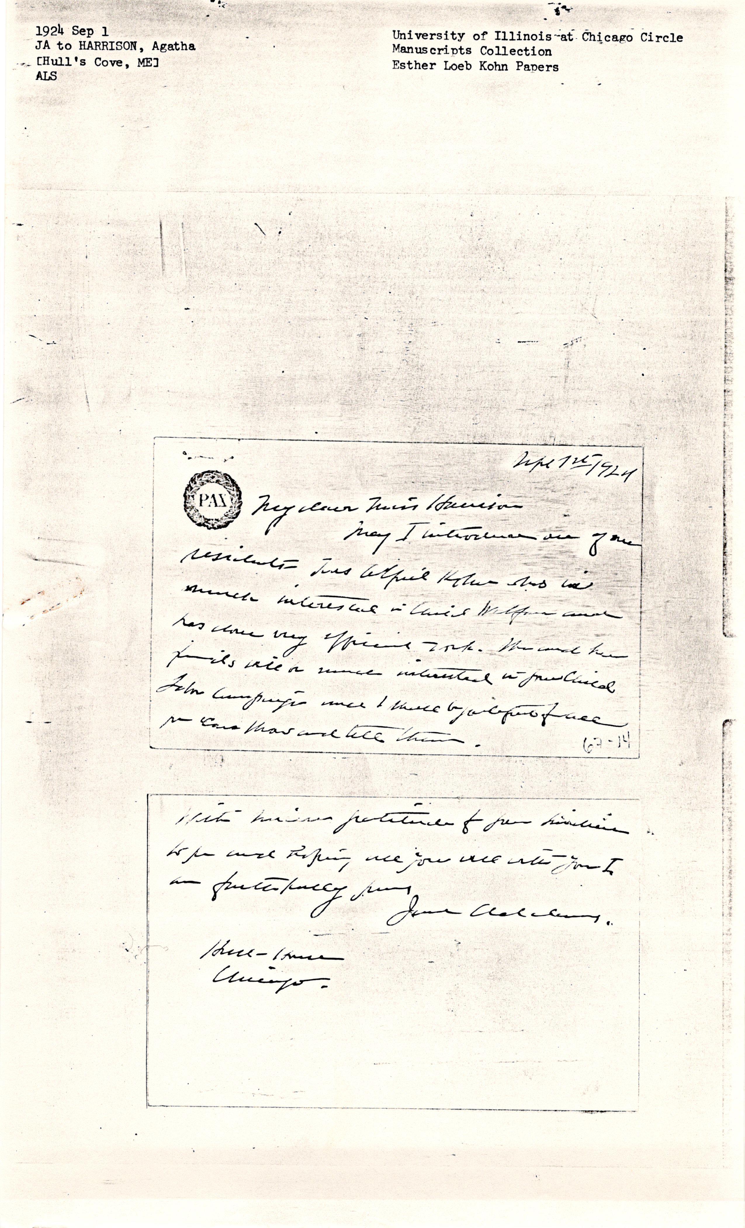 May I introduce one of our residents -- Mrs Alfred Kohn who is much interested in Child Welfare and has done very efficient work. She and her friends will be much interested in your Child Labor Campaign and I shall be grateful for all you can show and tell them. [page 2]
