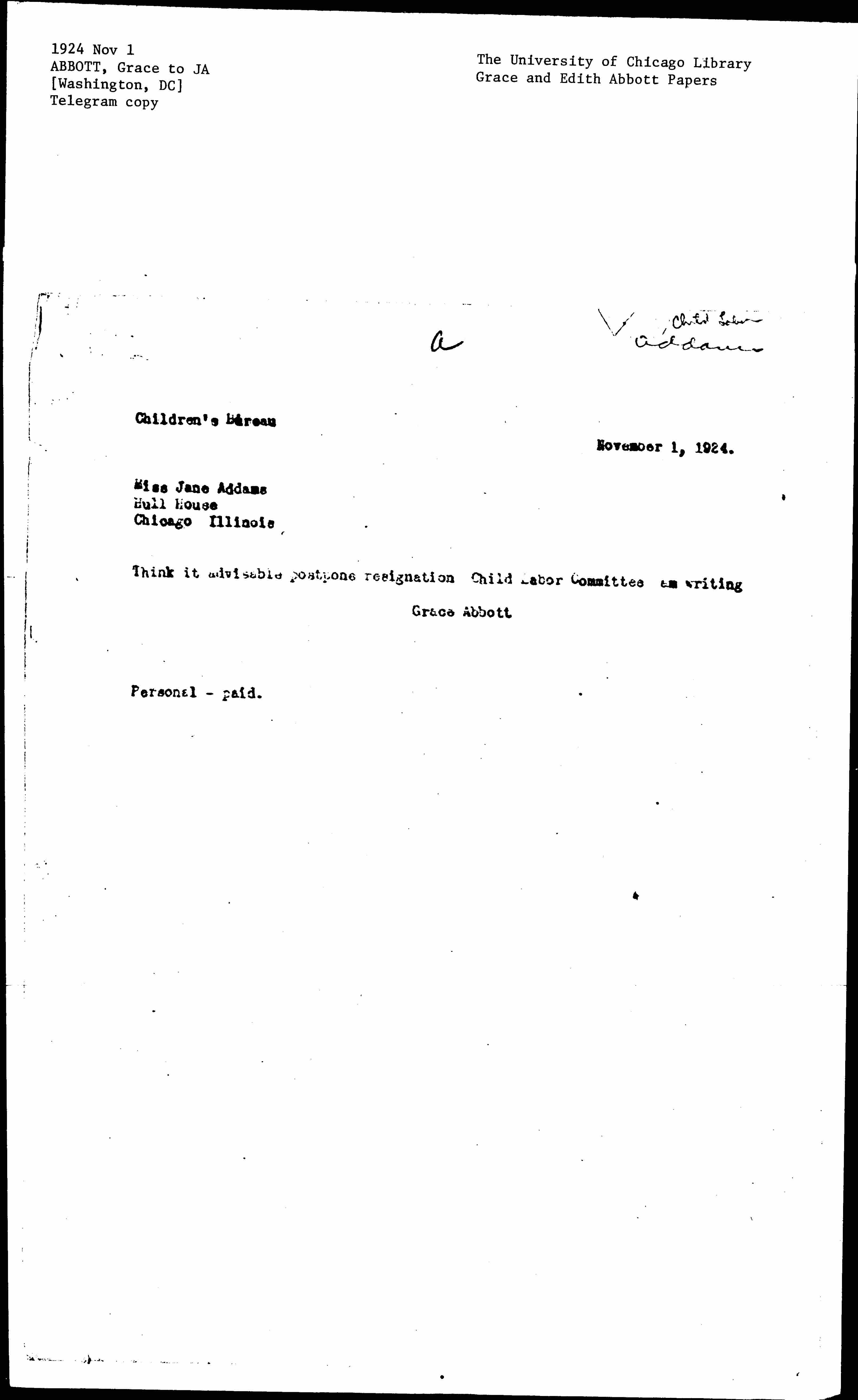 Miss Jane AddamsThink it advisable postpone resignation Child Labor Committee as writing
