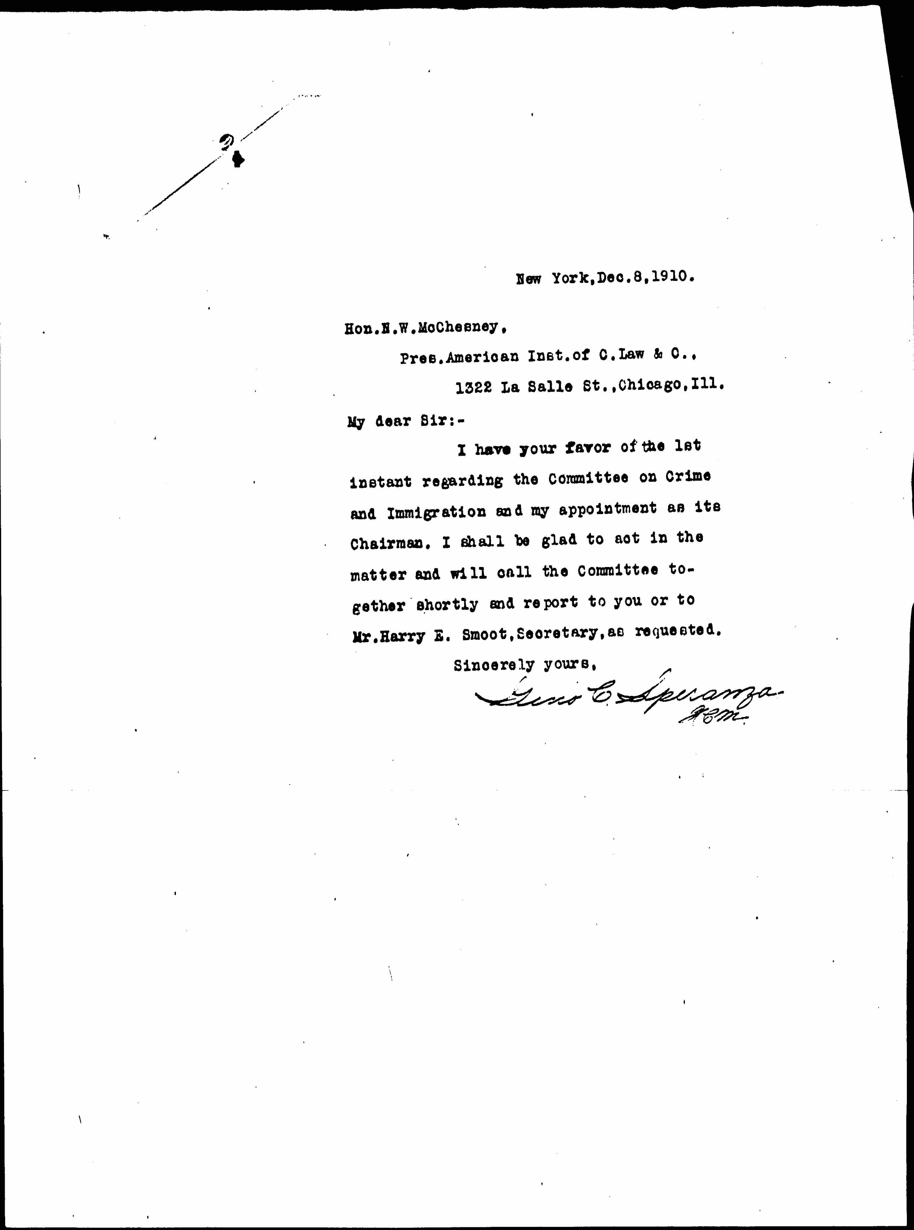 I have your favor of the 1st instant regarding the Committe on Crime and Immigration and my appointment as its Chairman. I shall be glad to act in the matter and will call the Committe together shortly and report to you or to Mr. Harry E. Smoot, Secretart, as requested.