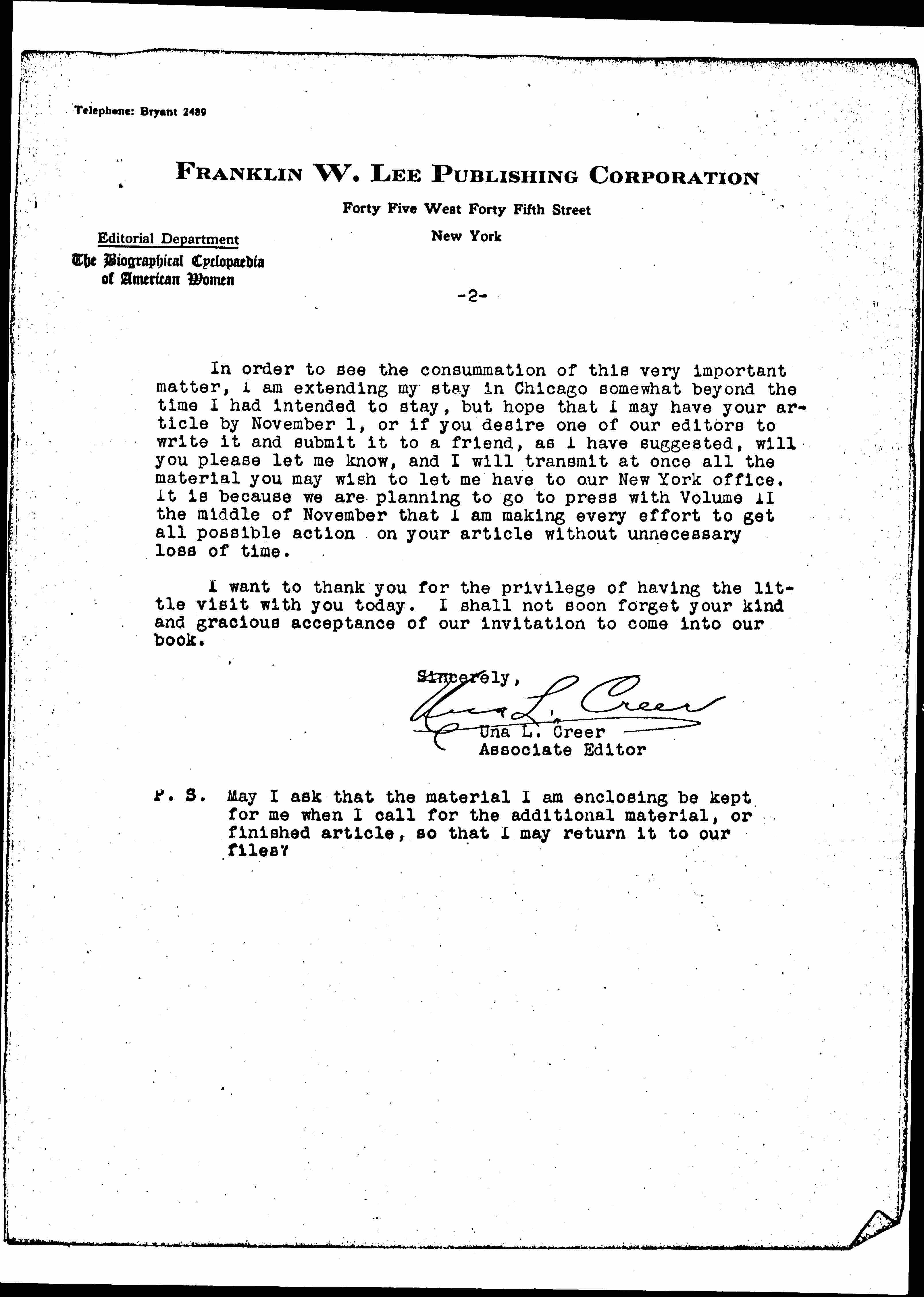 As I believe I tried to explain, both to you and to Mr. Byron, whenever we write the biography of a woman whose life is intimately connected with any certain movement or cause, we desire a sketch of that subject also, and if possible illustrations, and would like to have a brief history of Hull House in connection with your biography, and if that institution would like, a picture of Hull House could be run in addition to your portrait. In this same connection, it often happens that such an organization, as a matter of courtesy, wants the privilege of assuming the expense of inserting the photograph of the subject. This same matter came up in connection with the biography of Miss Cornelia Bradford, of Whittier House, Jersey City. In any case, we want your biography. The photograph is optional. [page 2]