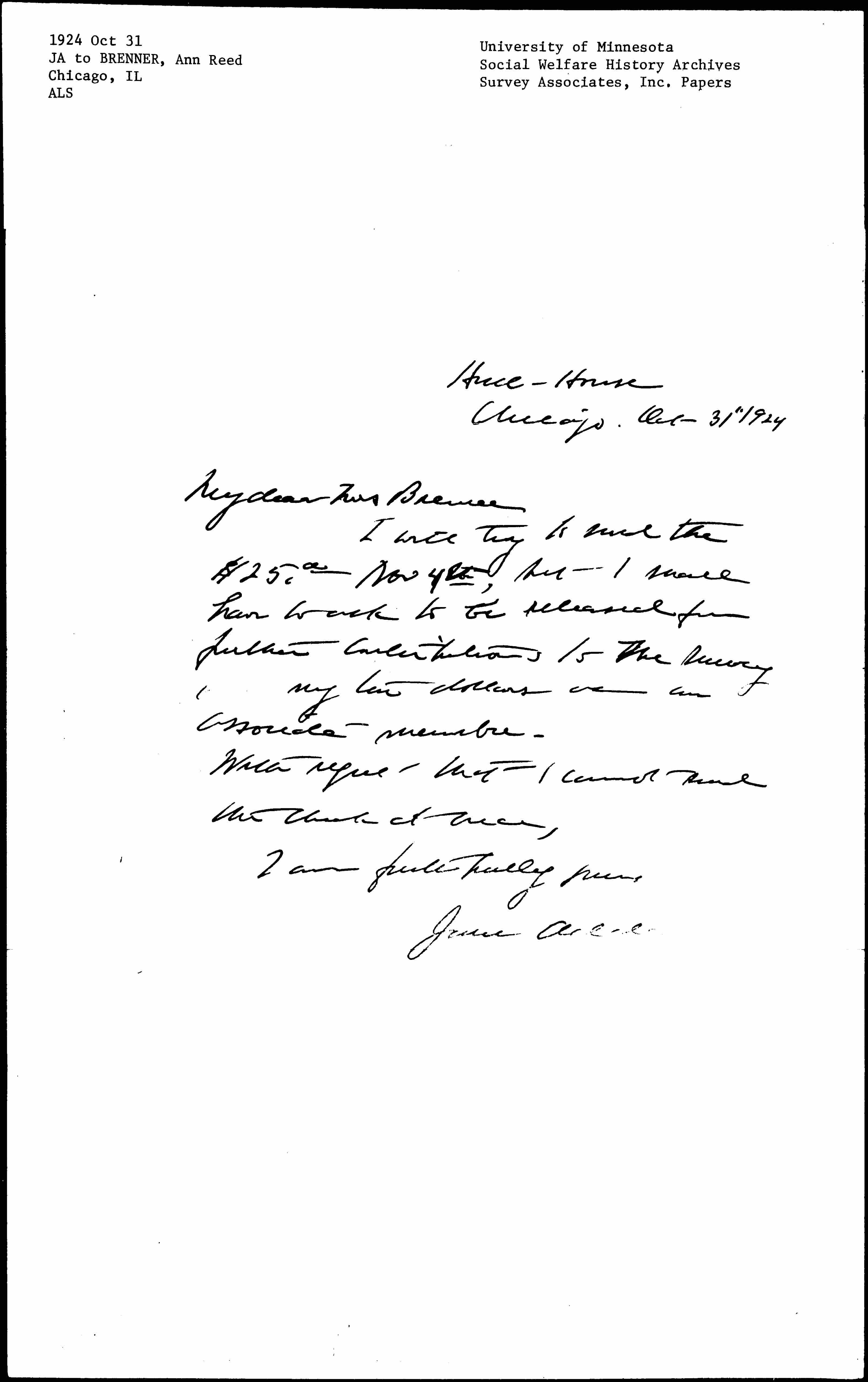 I will try to send the $25.00 Nov 4th, but I shall have to ask to be released for further contributions to The Survey [illegible] my ten dollars as an Associate member.