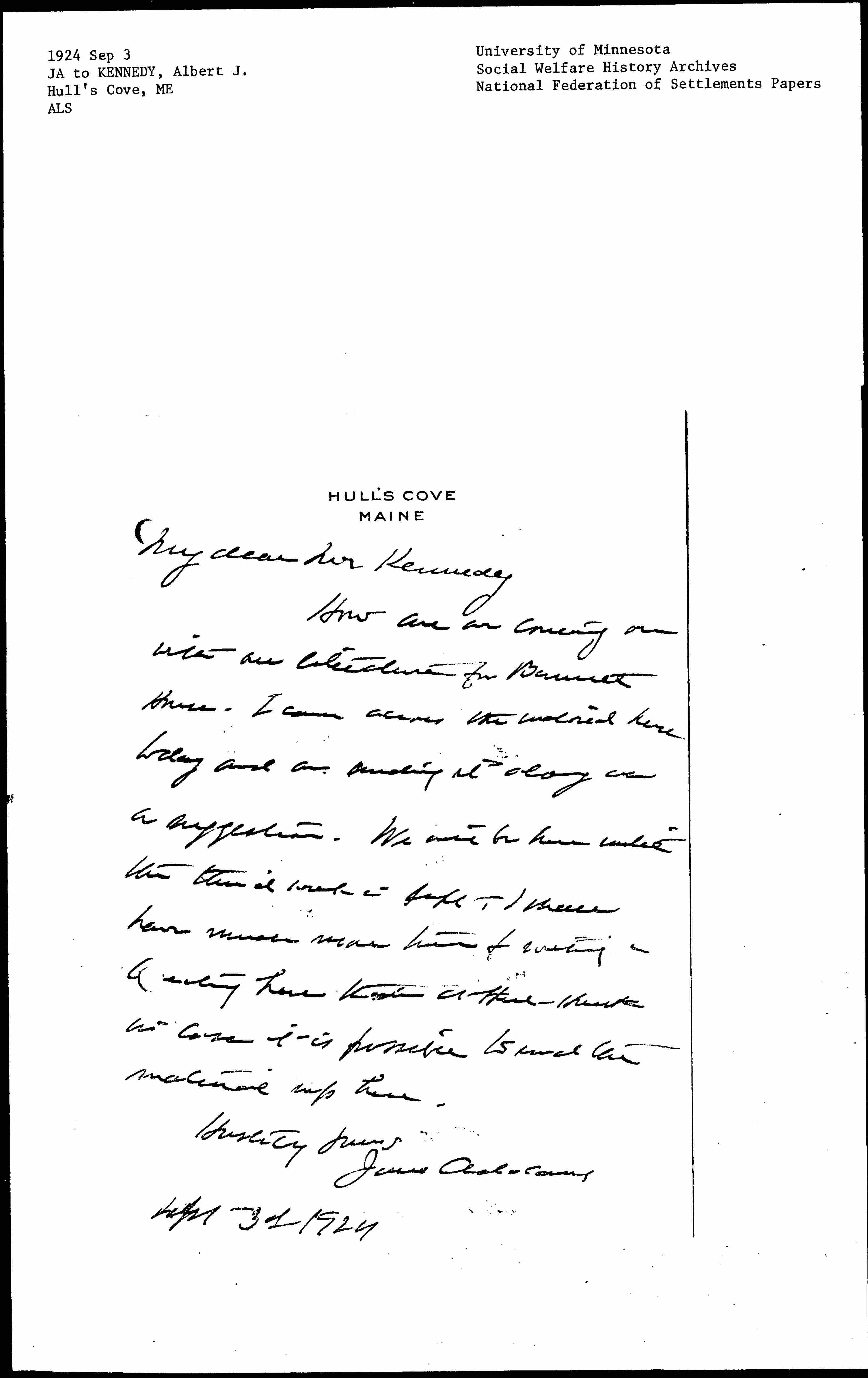 How are we coming on with our literature for Barnett House -- I came across the material here today and am sending it along as a suggestion. We will be here until the third week in Sept. I shall have much more time for writing & [working?] here than at Hull-House in case it is possible to send the material up here.