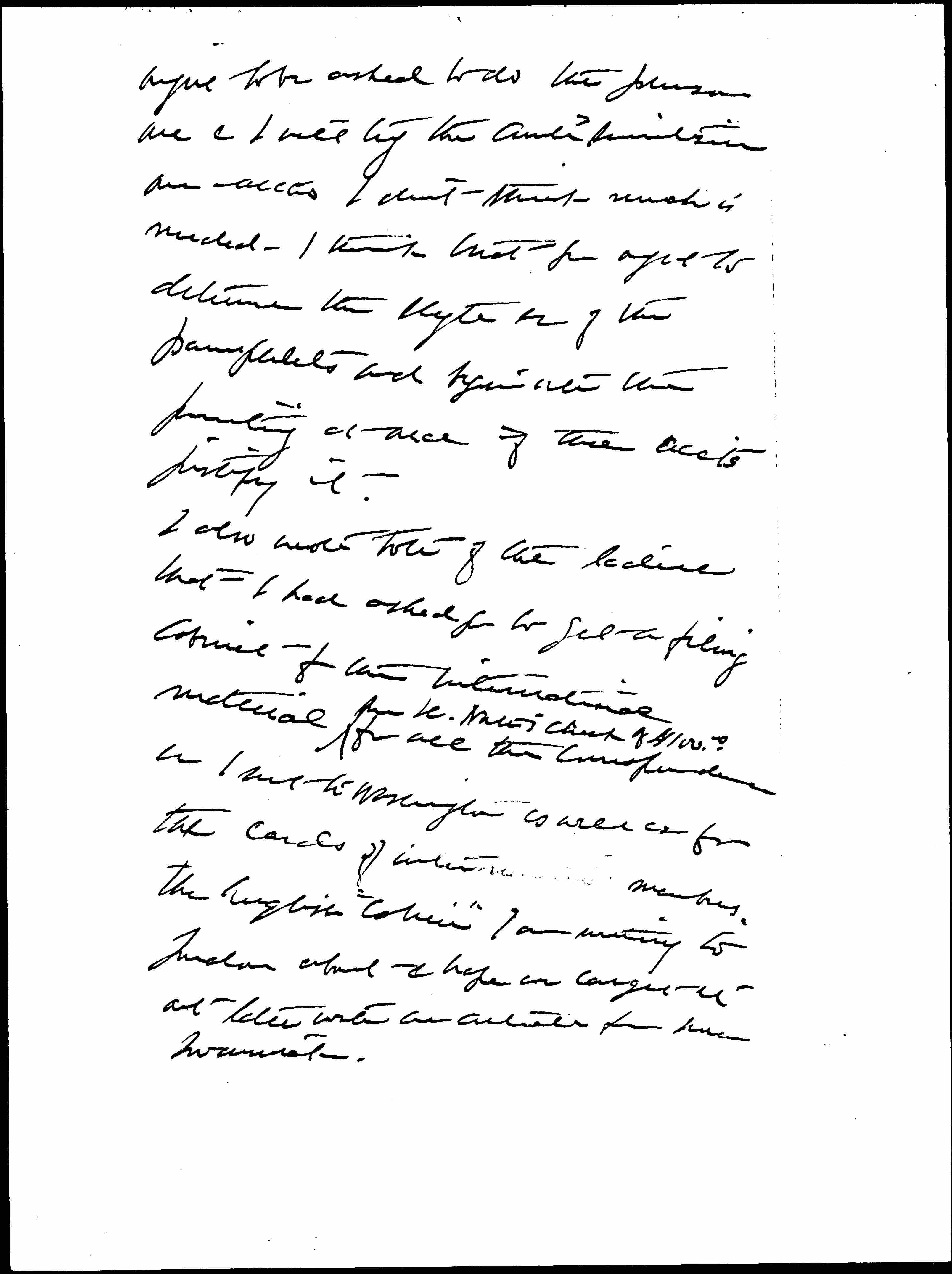 I also wrote both of the ladies that I had asked you to get a filing cabinet for the international material ↑from D. North's check of $100.00↓ for all the correspondence [etc.] I sent to Washington as well as for the cards of international members. The English "cahier" I am writing to London about & hope we can get it out later with an article from Mrs Swanwick. [page 3]