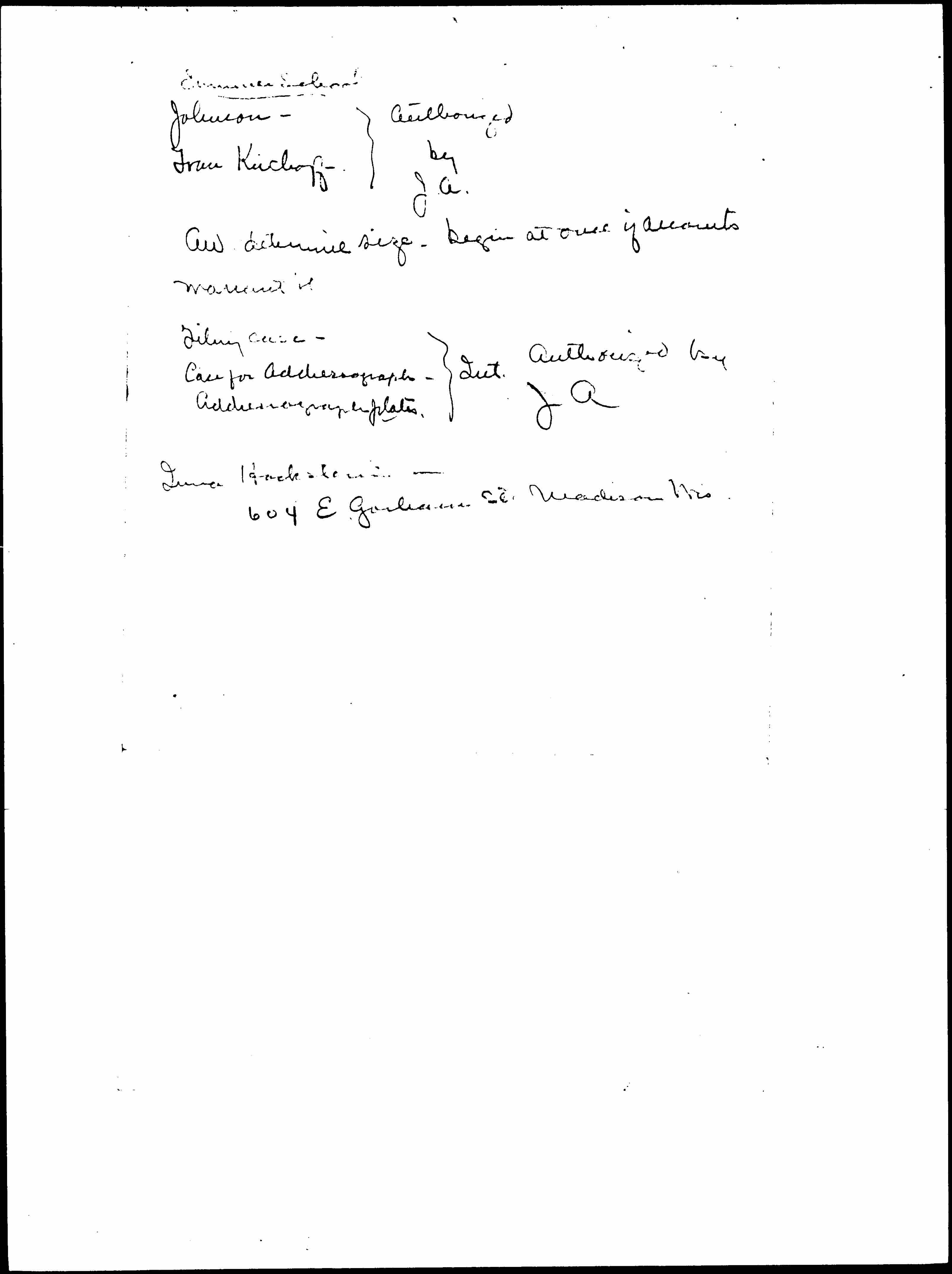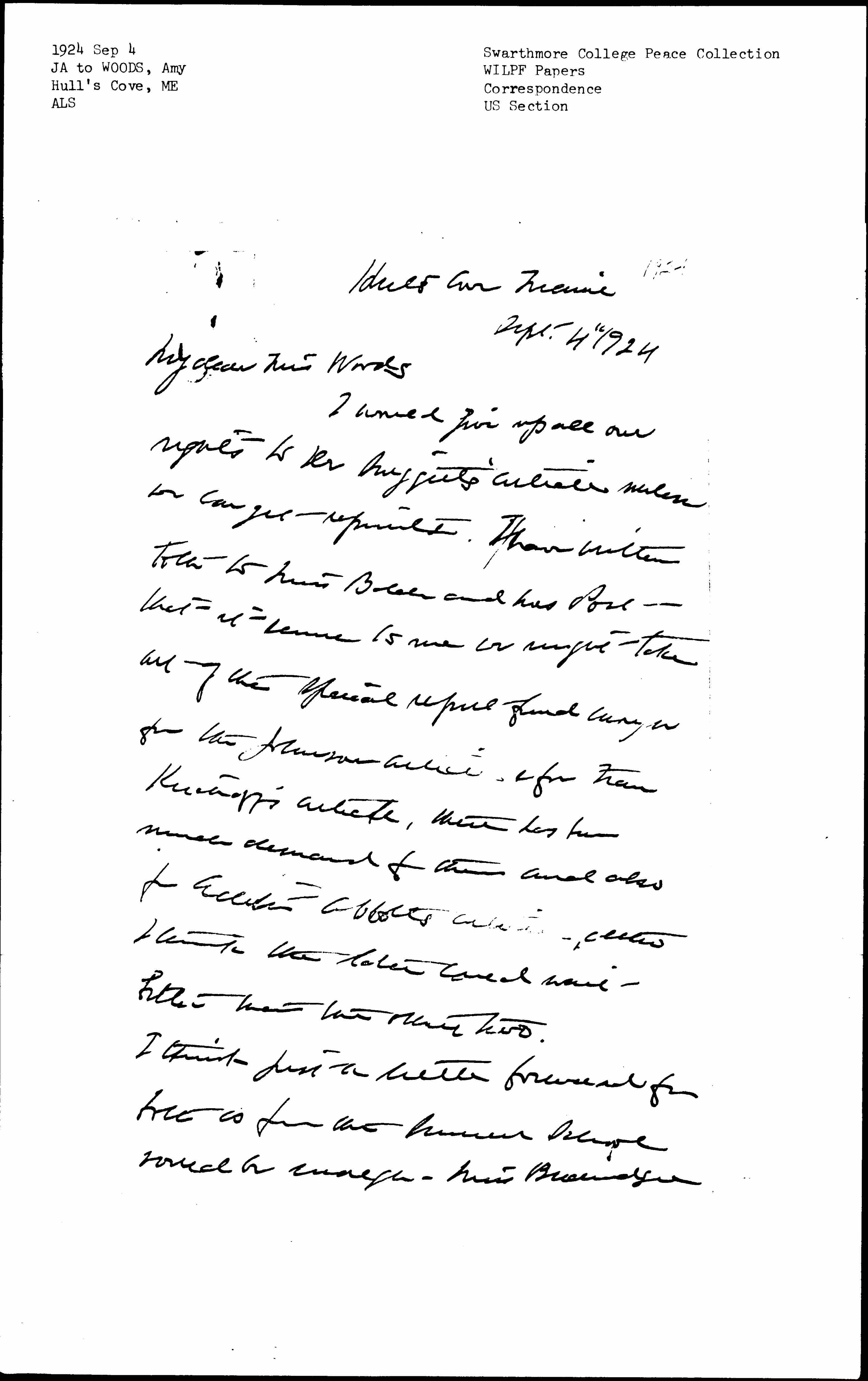 I would give up all our rights to Dr Swiggett's article unless we can get reprints. I have written both to Miss Balch and Mrs Post -- that it seems to me we might take out of the special report fund enough for the Johnson article & for Frau [Kirchhoff]'s article, there has been much demand for them and also for Edith Abbotts article -- [although] I think the later could wait better than the other two.