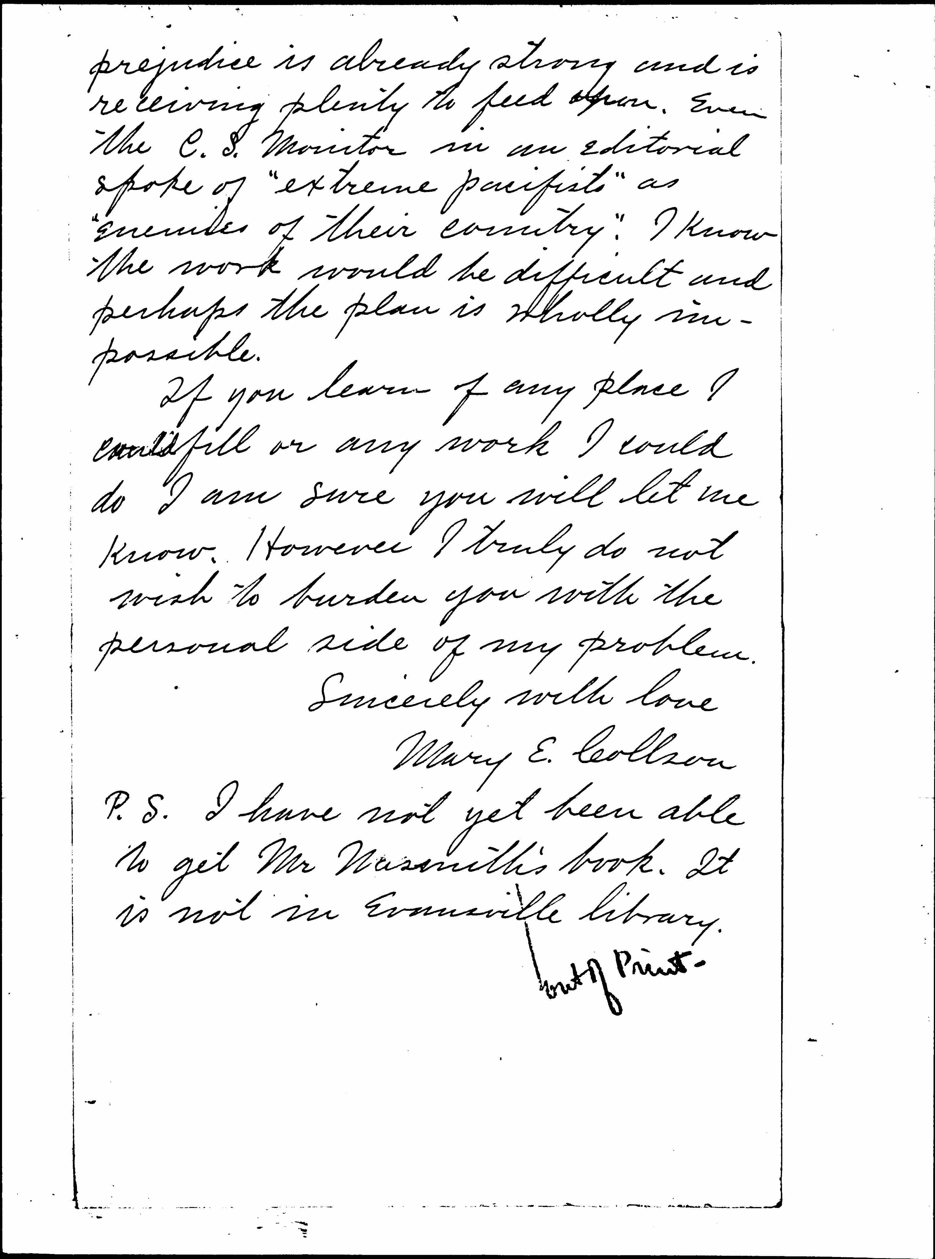 I believe I could be useful if I could get started. I [thought] if I could arouse interest [enough] to form groups as centers for carrying on work that we could raise money [enough] to pay expenses but in such communities as Evansville the anti-pacifist [page 5] prejudice is already strong and is receiving plenty to feed upon. Even the C.S. Monitor in an editorial spoke of "extreme pacifists" as "enemies of their country." I know the work would be difficult and perhaps the plan is wholly impossible.