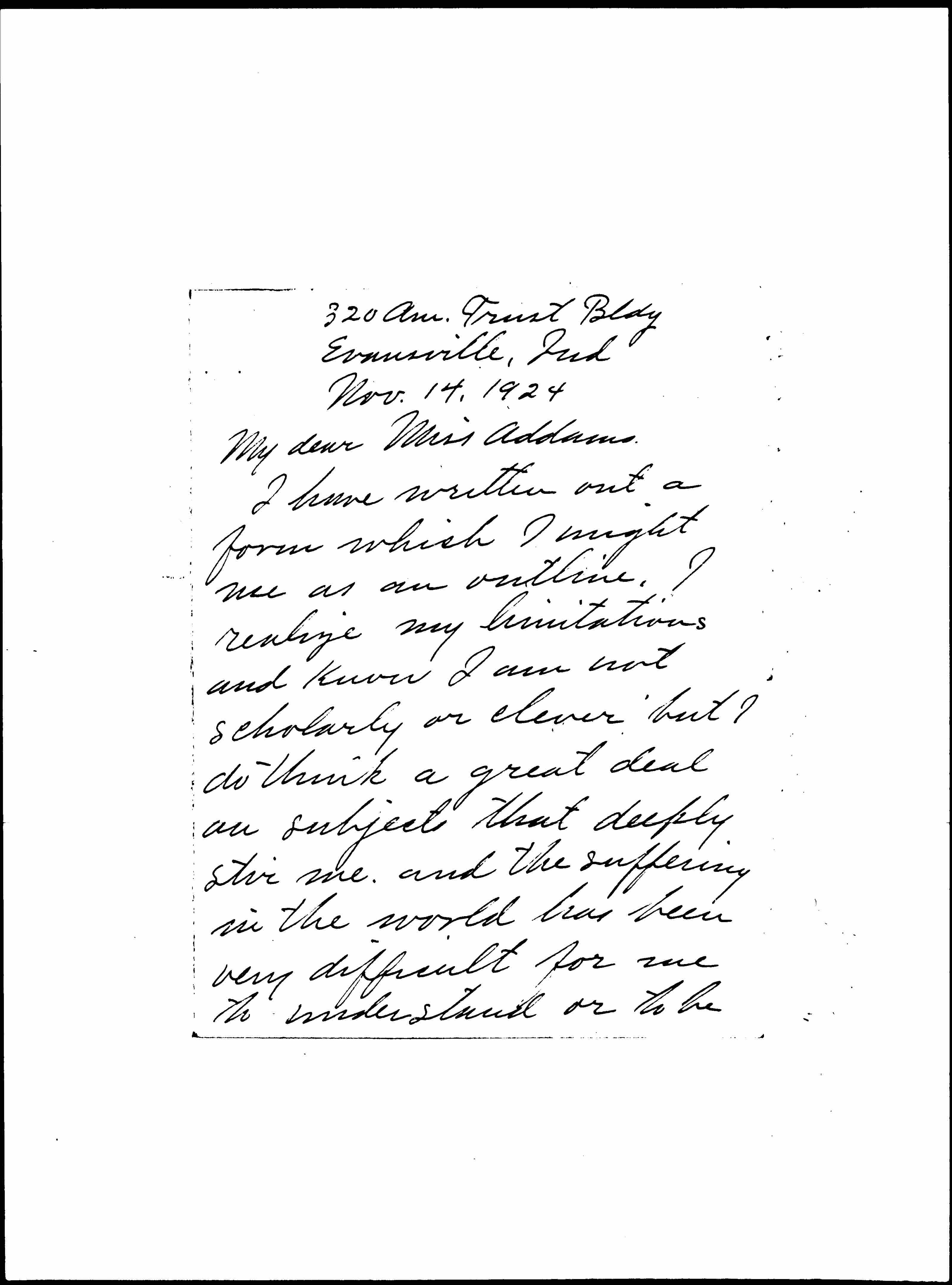 I have been interested in the problem of peace since 1914. I never has quite understood what war meant until then. I was so confused I could not find a way to do [page 4] anything [although] I made [spasmed?] attempts. I helped the radicals and conscientious objector all I possibly could financially but that is as far as I got.