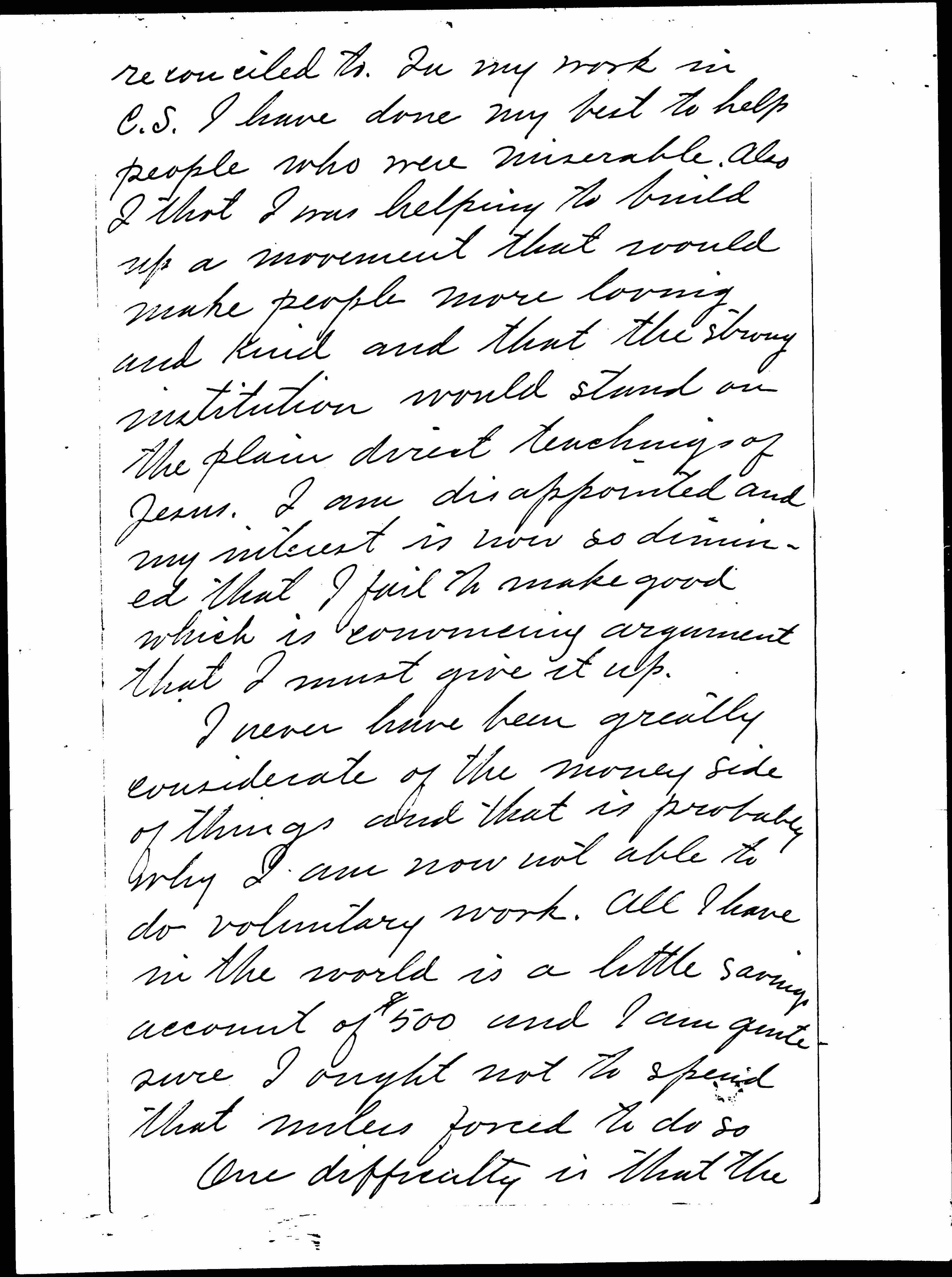 I have written out a form which I might use as an outline. I realize my limitations and know I am not scholarly or clever but I do think a great deal on subjects that deeply stir me, and the suffering in the world has been very difficult for me to understand or to be [page 2] reconciled to. In my work in C.S. I have done my best to help people who were miserable. Also I [thought] I was helping to build up a movement that would make people more loving and kind and that the strong institution would stand on the plain direct teachings of Jesus. I am disappointed and my interest is now so dimmed that I fail to make good which is convincing argument that I must give it up.