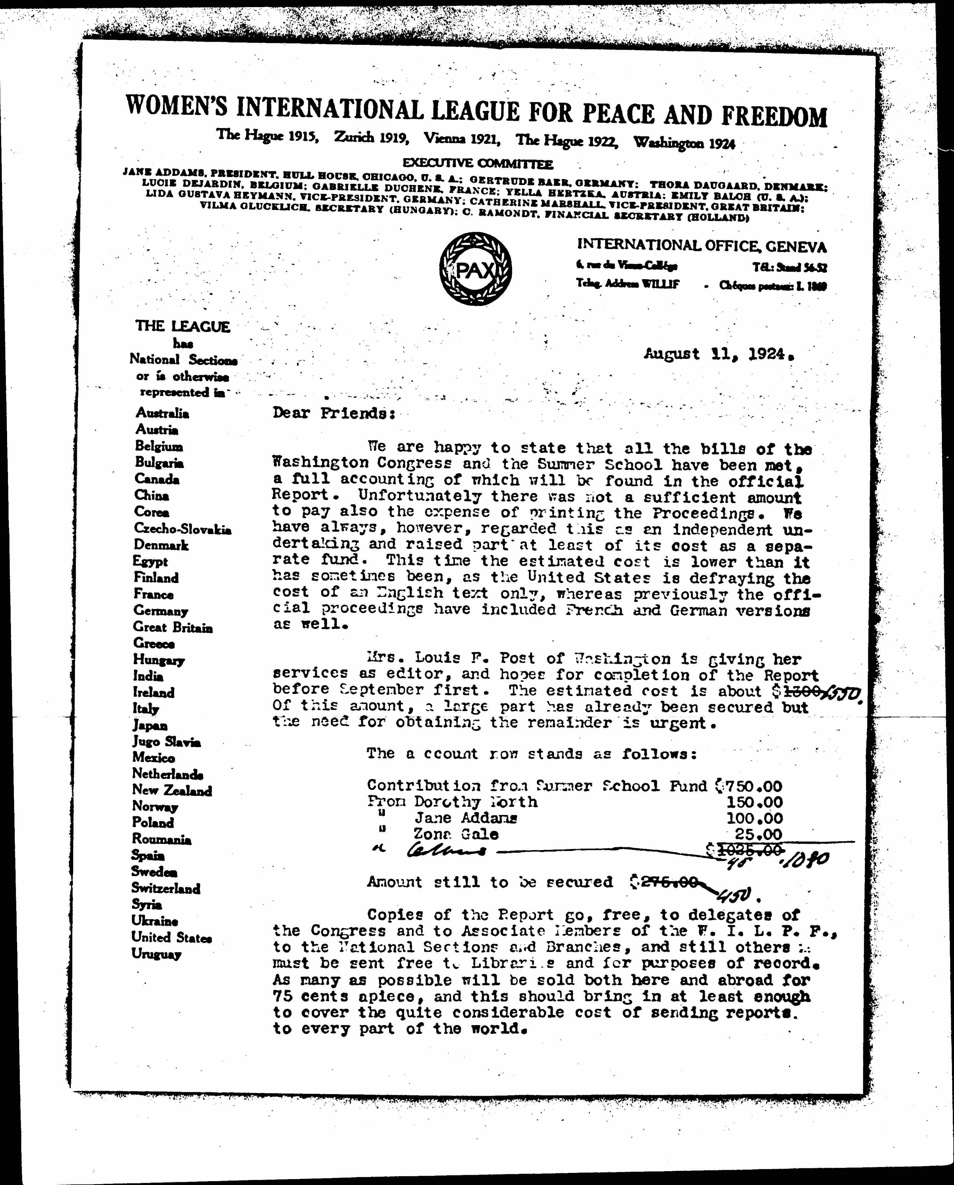 Copies of the Report go, free, to delegates of the Congress and to Associate Members of the W.I.L.P.F., to the National Sections and Branches, and still others must be sent free to Libraries and for purposes of record. As many as possible will be sold both here and abroad for 75 cents apiece, and this should bring in at least enough to cover the quite considerable cost of sending reports to every part of the world. [page 2]