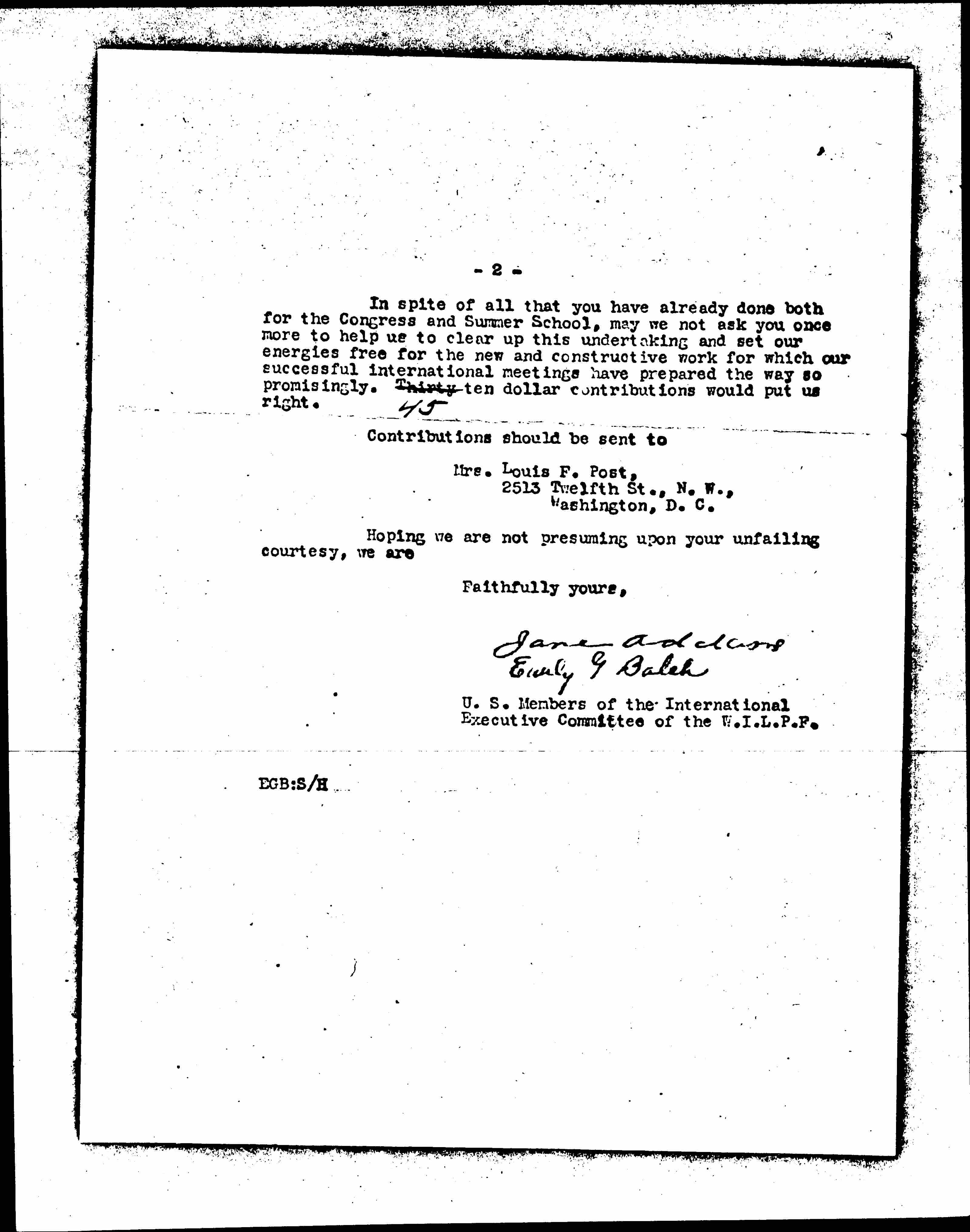 In spite of all that you have already done both for the Congress and Summer School, may we not ask you once more to help us to clear up this undertaking and set our energies free for the new and constructive work for which our successful international meetings have prepared the way so promisingly. Thirty ↑45↓ ten dollar contributions would put us right.