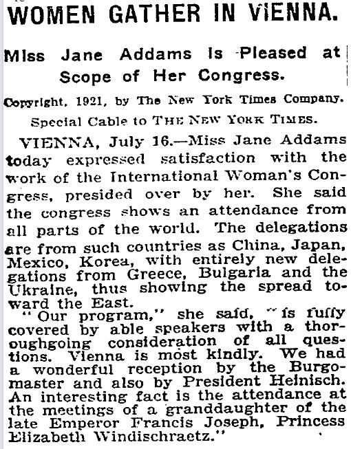 "Our program," she said, "is fully covered by able speakers with a thoroughgoing consideration of all questions. Vienna is most kindly. We had a wonderful reception by the Burgomaster and also by President [Hainisch]. An interesting fact is the attendance at the meetings of a granddaughter of the late Emperor Francis Joseph, Princess Elizabeth [Windisch-Graetz]."