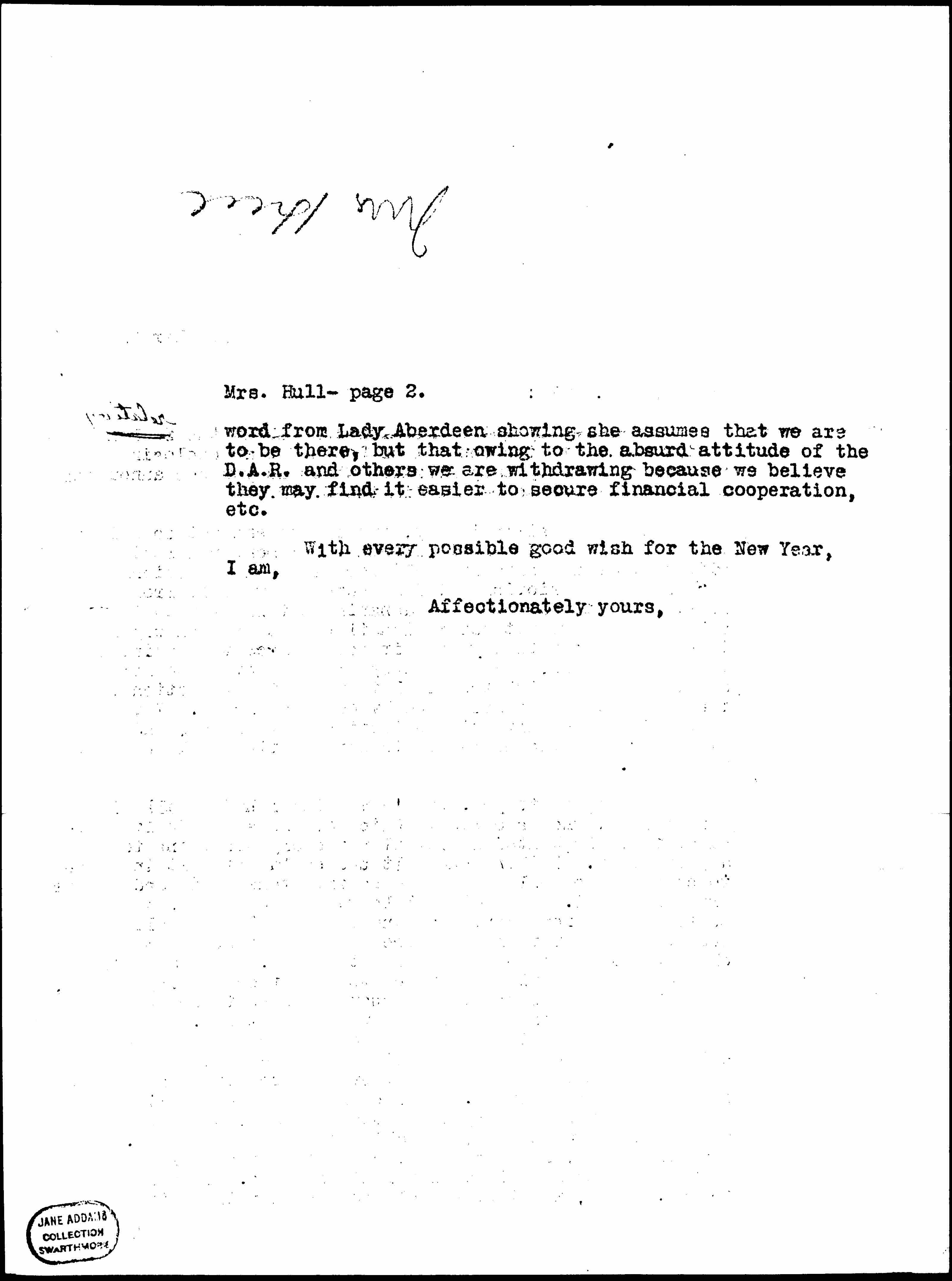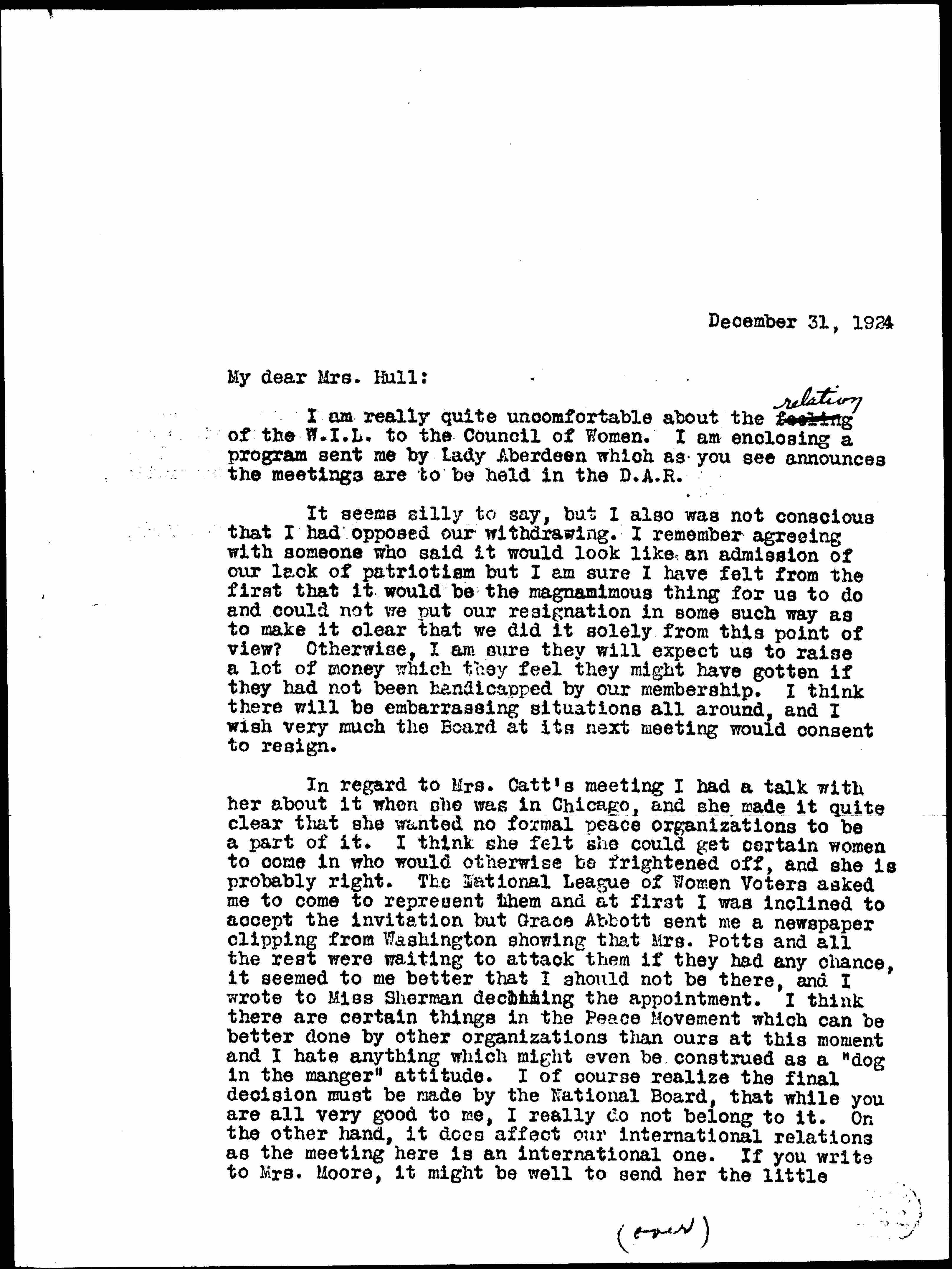 In regard to Mrs. Catt's meeting I had a talk with her about it when she was in Chicago, and she made it quite clear that she wanted no formal peace organizations to be a part of it. I think she felt she could get certain women to come in who would otherwise be frightened off, and she is probably right. The National League of Women Voters asked me to come to represent them and at first I was inclined to accept the invitation but Grace Abbott sent me a newspaper clipping from Washington showing that Mrs. Potts and all the rest were waiting to attack them if they had any chance, it seemed to me better that I should not be there, and I wrote to Miss [Sherwin] declining the appointment. I think there are certain things in the Peace Movement which can be better done by other organizations than ours at this moment and I hate anything which might even be construed as a "dog in the manger" attitude. I of course realize the final decision must be made by the National Board, that while you are all very good to me, I really do not belong to it. On the other hand, it does affect our international relations as the meeting here is an international one. If you write to Mrs. Moore, it might be well to send her the little ↑(over)↓ [page 2] word from Lady Aberdeen showing she assumes that we are to be there, but that owing to the absurd attitude of the D.A.R. and others we are withdrawing because we believe they may find it easier to secure financial cooperation, etc.