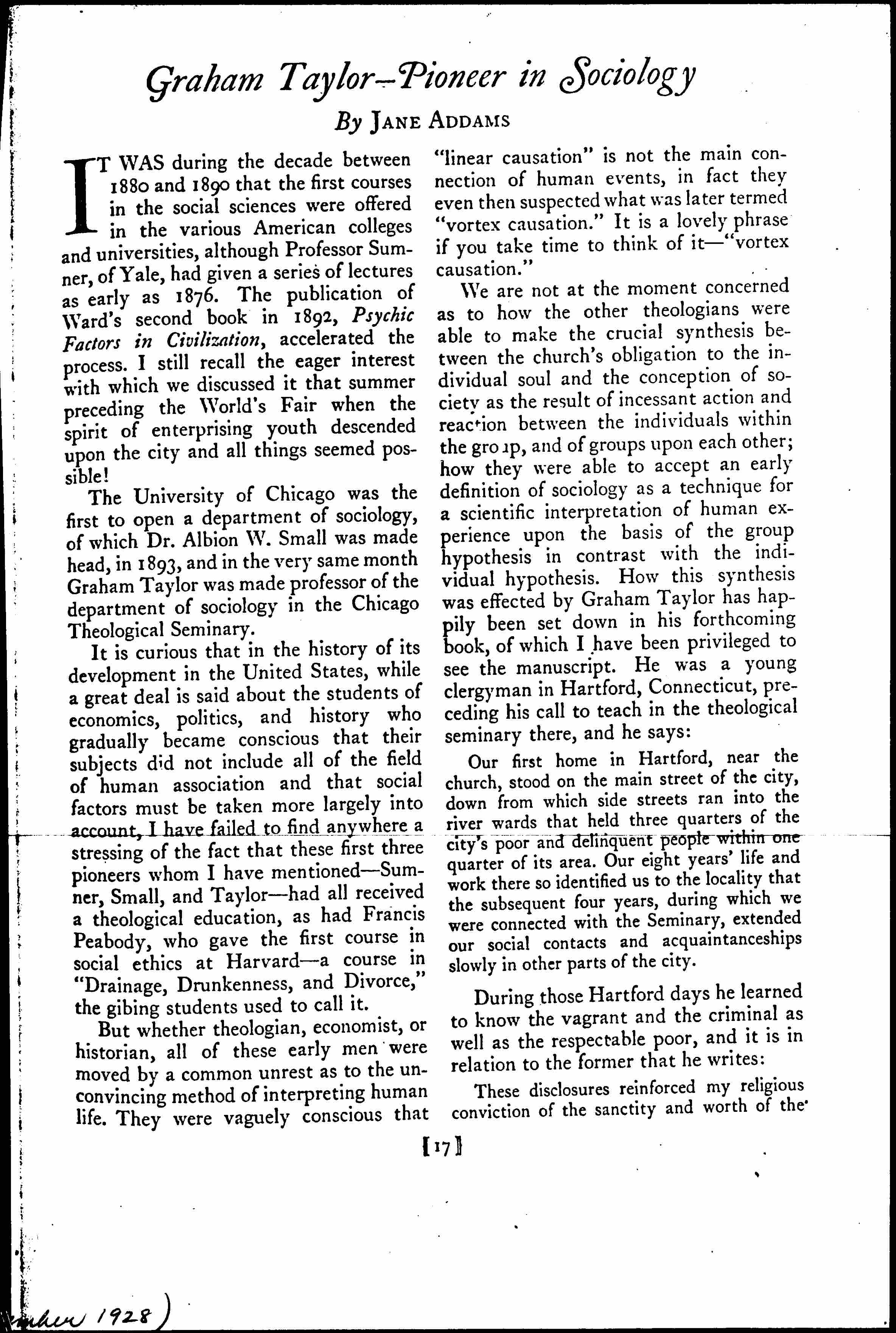 Graham Taylor: Pioneer in Sociology, November 18, 1928
