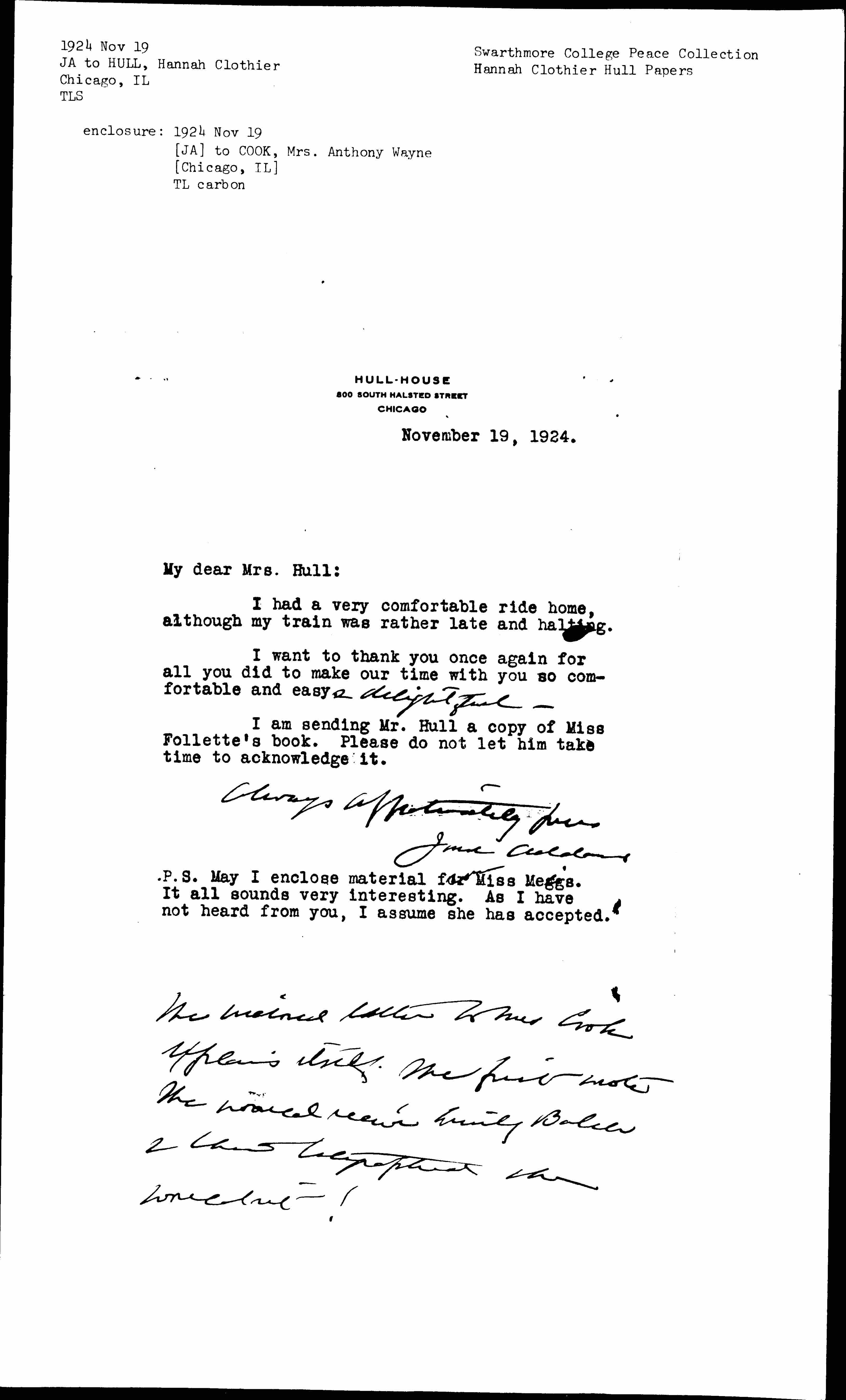 ↑The [enclosed] letter to Mrs Cook explains itself. She first wrote she would receive Emily Balch & then telegraphed she wouldn't!